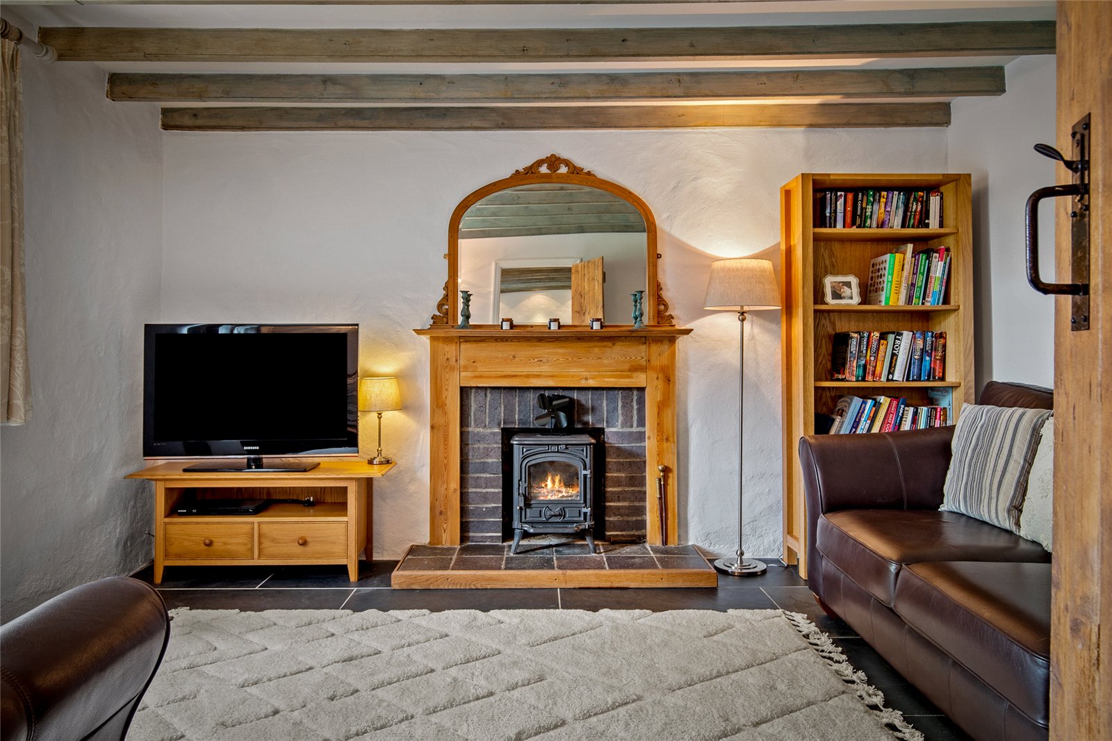 Under an wooden mantelpiece & surround, there is a log burner set upon a stone hearth, again giving this space a sense of cosiness and warmth.