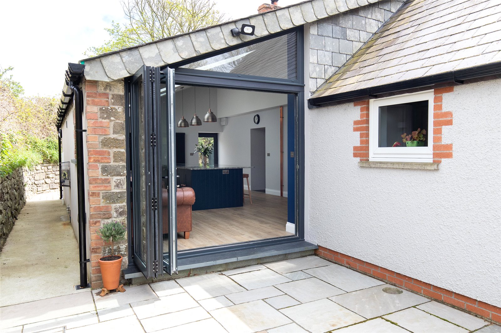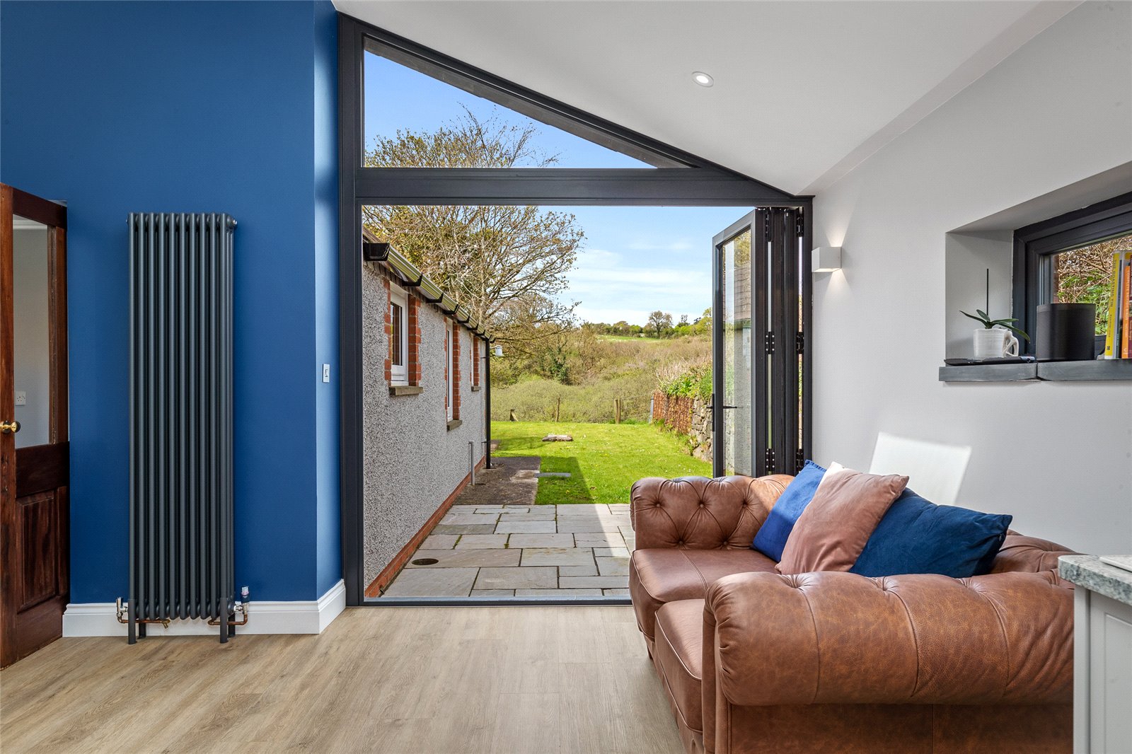The floor is Kahrs luxury vinyl wood-effect plank flooring and the ceiling is spotlighted throughout. There are French uPVC double-glazed anthracite grey doors, a uPVC double-glazed anthracite door giving side access, as well as anthracite Aluminium bi-folding doors, with feature window above, that give access to the garden patio. Additionally, there are three large double-glazed Velux skylights overhead, ensuring sunlight throughout the day. Floor to ceiling radiators punctuate either end of the room, and there is ample space adjacent to the kitchen units for a mounted television and sofas.