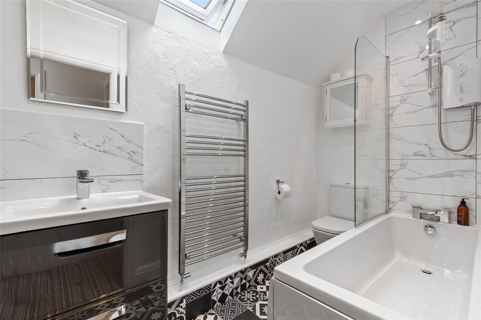 Family bathroom suite, benefitting from Roca bath, with waterfall mixer tap and Mira electric shower over, pedestal wash basin with waterfall mixer tap and fitted bathroom drawers below, dual-flush close-coupled toilet, heated towel rails, vinyl flooring, with double-glazed Velux skylight and spotlighting to ceiling.