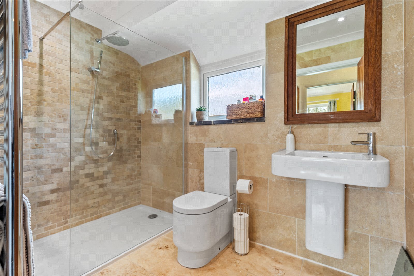 Sizeable shower room, recently renovated to a particularly high standard. Benefitting from a Bristan rainfall shower, as well as handheld shower attachment, with stone resin tray and variable temperate controls, as well as large glass screen panel, close-coupled toilet, handwash basin with mixer tap, mosaic-effect Travatine natural stone floor-to-ceiling tiling, spotlighting, extractor fan and uPVC obscure glass double-glazed window.