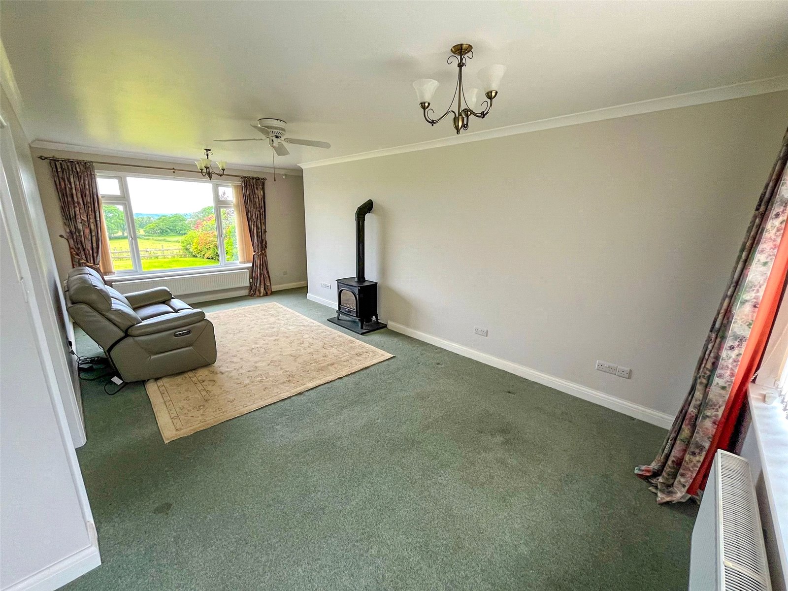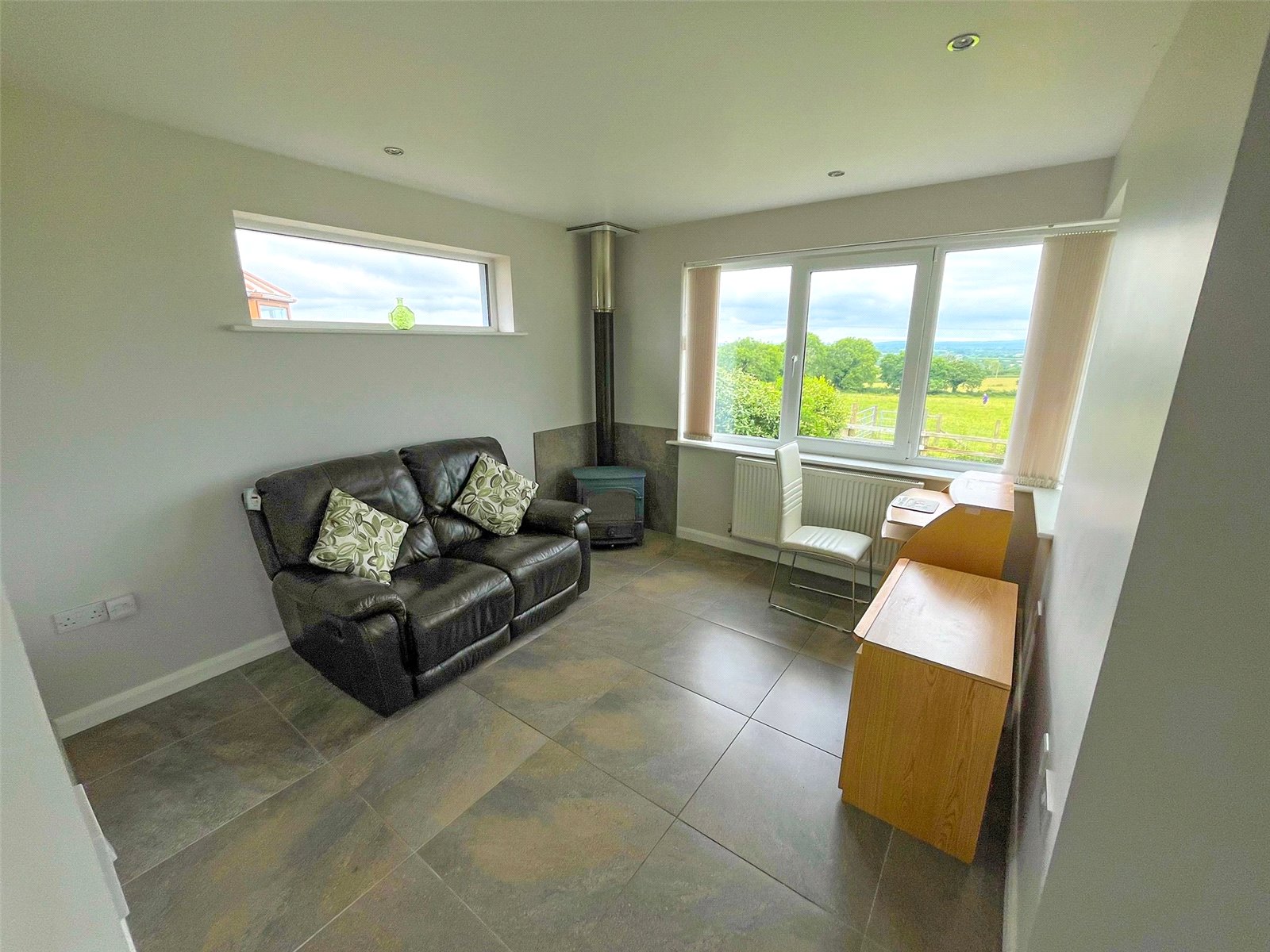 Carpeted floor, 2x radiators, 2x ceiling lights, ceiling fan, multi-fuel burner on slate hearth, 2 x uPVC double glazed windows, one with a view to the rear, access to garage.