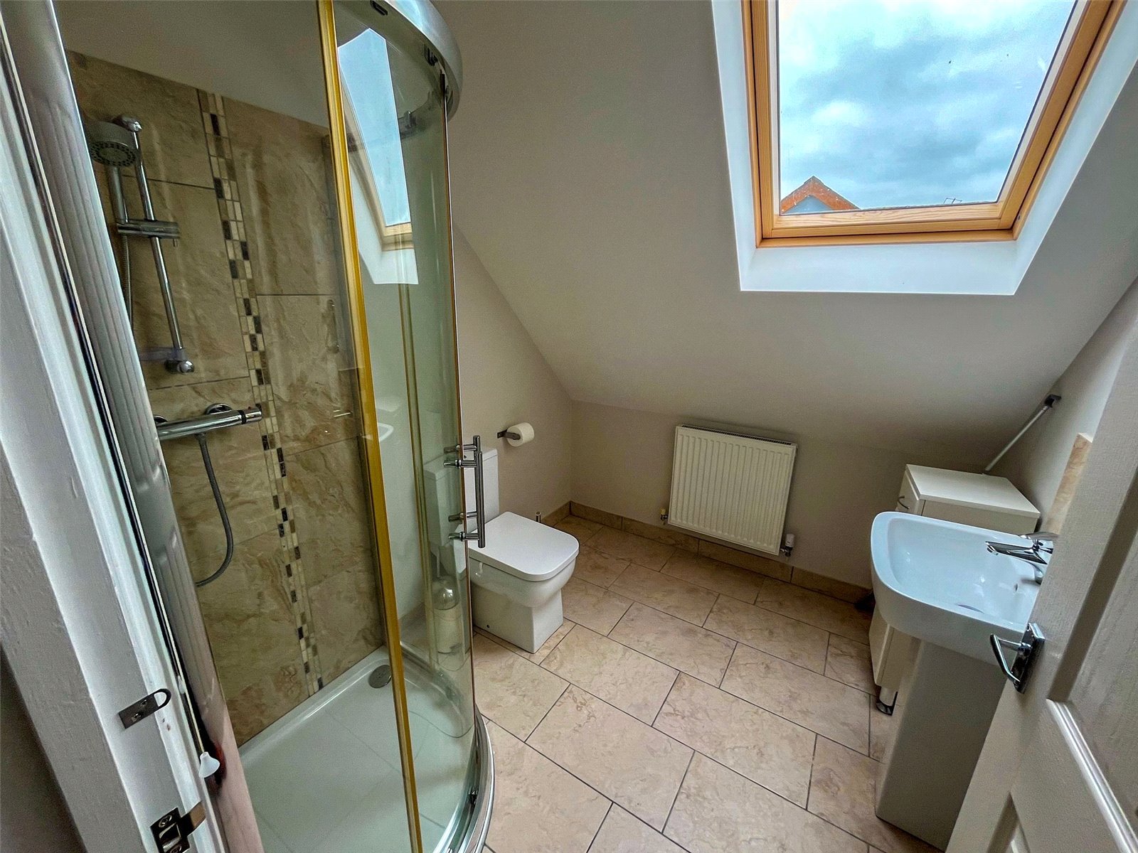 Tiled floor, WC, corner shower with tiled splashback and sliding glass doors, wash hand basin with mixer tap, wooden Velux window, ceiling light.