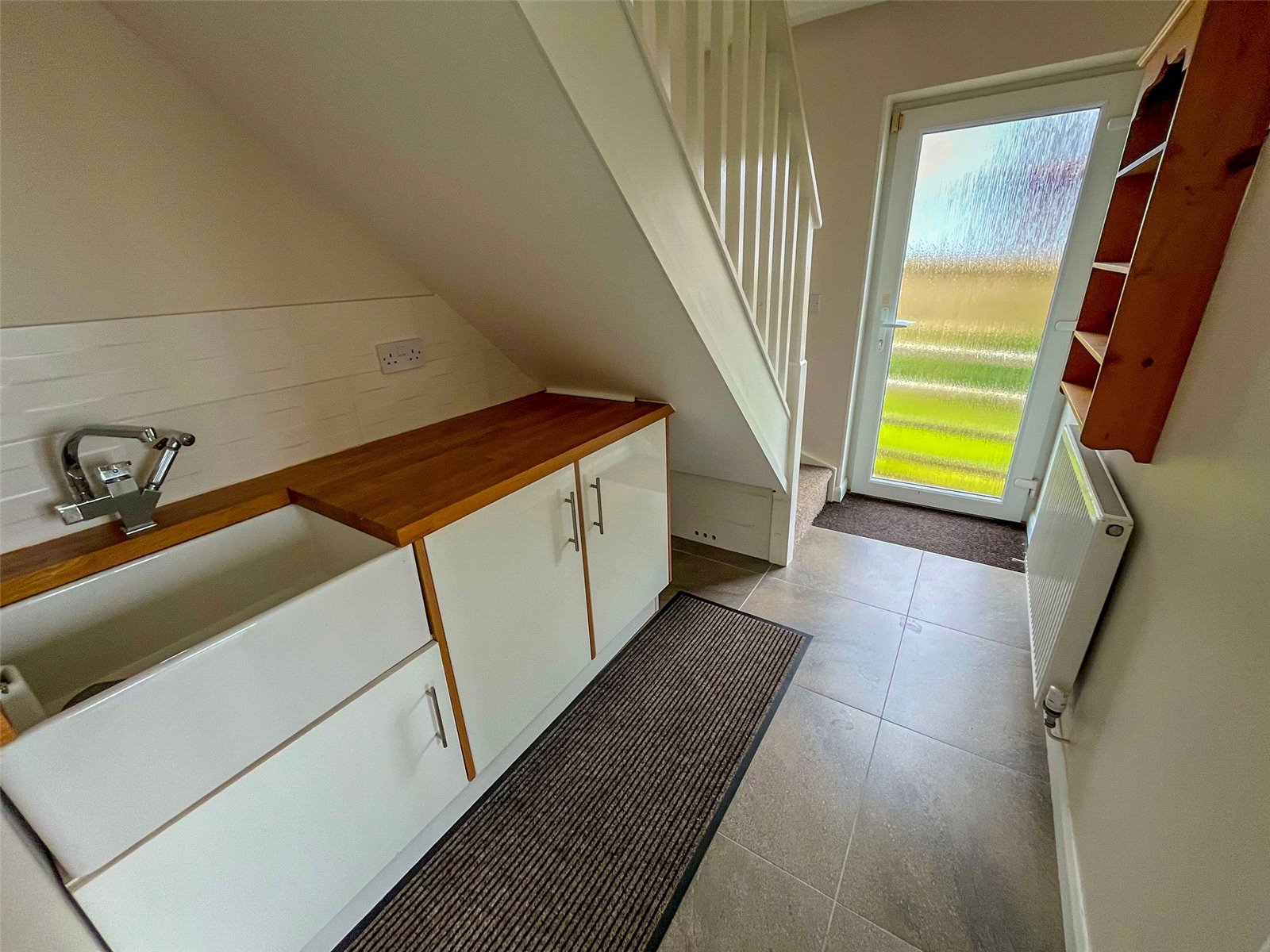 Tiled floor, UPVC double glazed window with obscured glass, range of base units under stairs with inset sink and mixer taps, radiator, ceiling light. Stairs to;