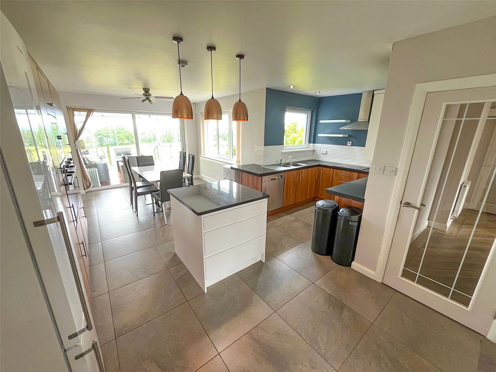 Arrangement of base and wall units with electric hob and overhead extractor fan, 1.5 sink and drainer with mixer tap, central island with storage and electric point, floor to ceiling units with integrated eye-level double oven and microwave, tiled floor, ceiling lights, ceiling fan, 2UPVC double glazed windows to rear, UPVC double glazed sliding doors to conservatory.