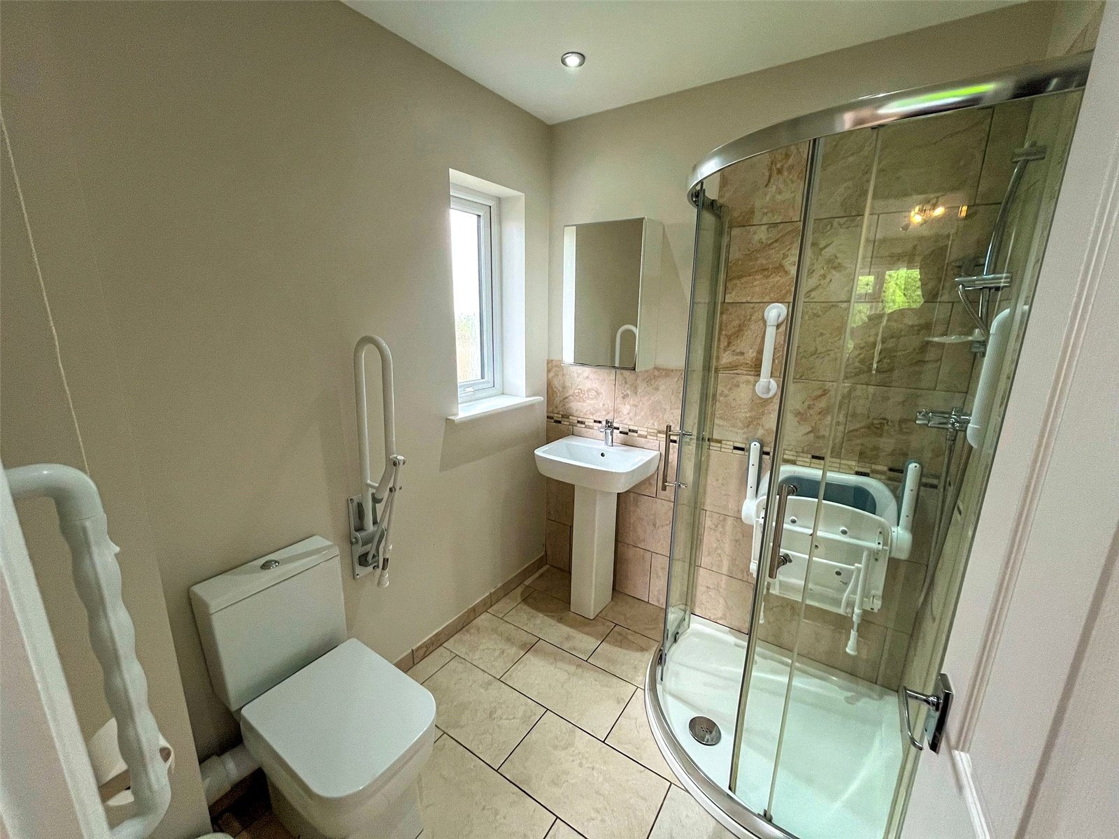Tiled floor, WC, wash hand basin with mixer taps and mirrored cabinet above, corner shower with tiled surround and sliding glass doors, heated towel rail, ceiling spotlights.