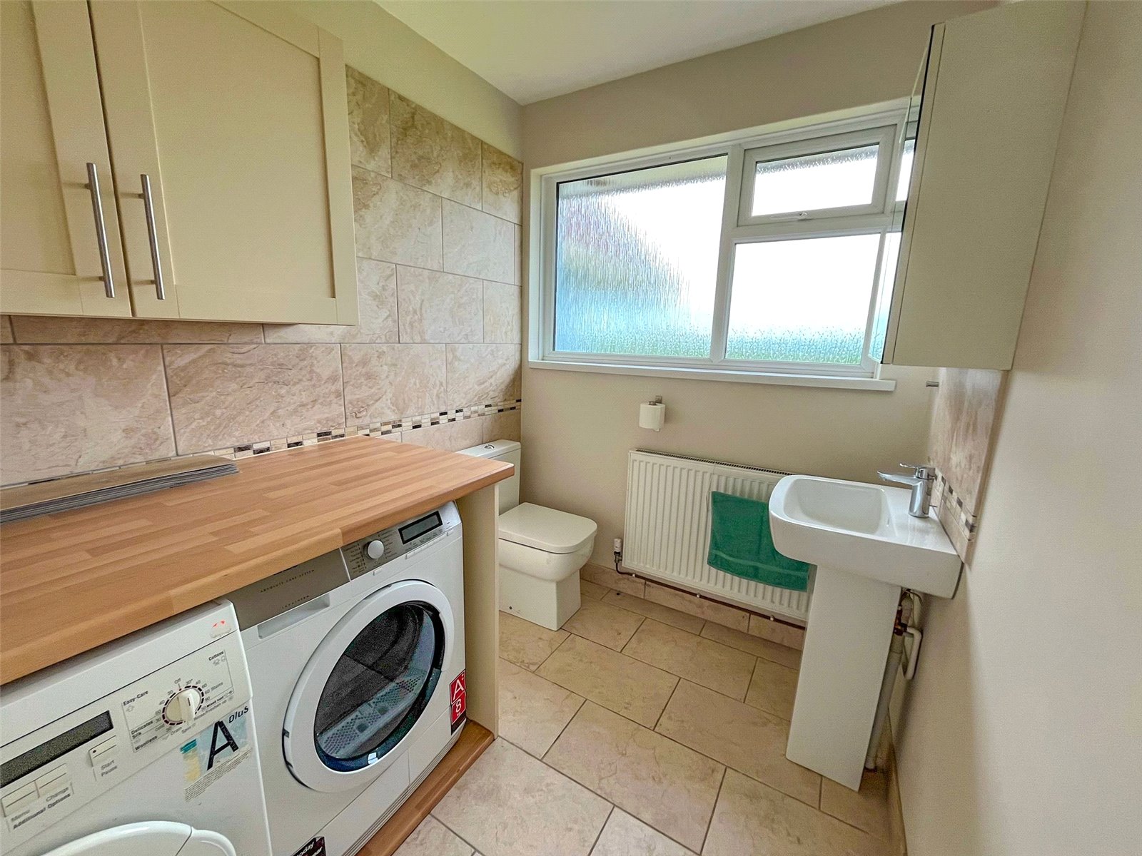 Tiled floor, radiator, wash hand basin with mixer tap and overhead mirrored cabinet, WC, wall and base unit with space for washing machine and dryer, UPVC double glazed window with obscured glass, ceilings spotlights and extractor fan.
