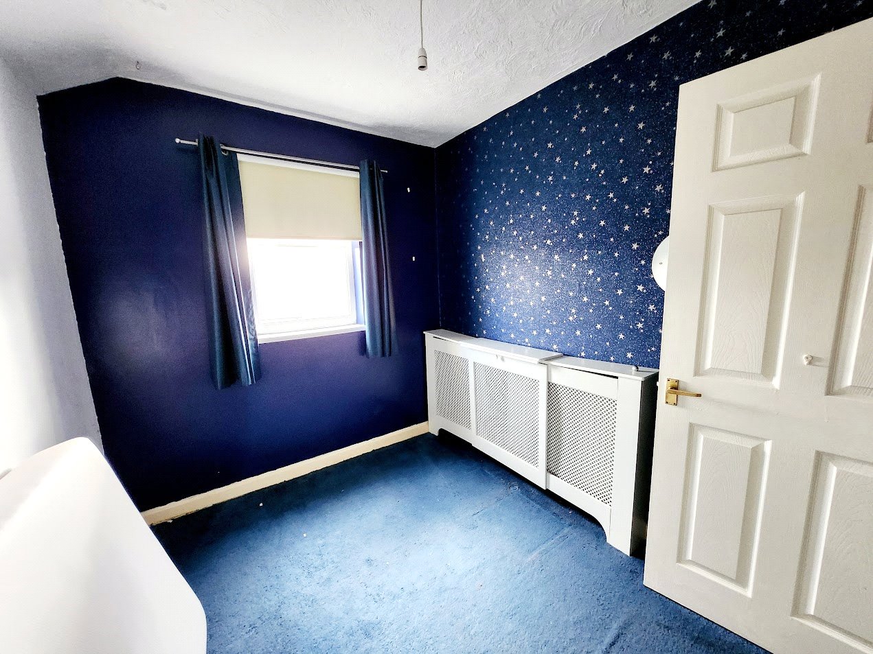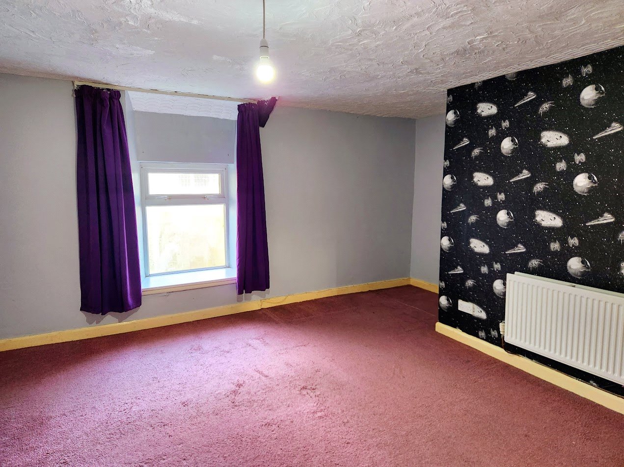 Rear-facing bedroom, with carpeted flooring, radiator, lighting and uPVC double-glazed window.