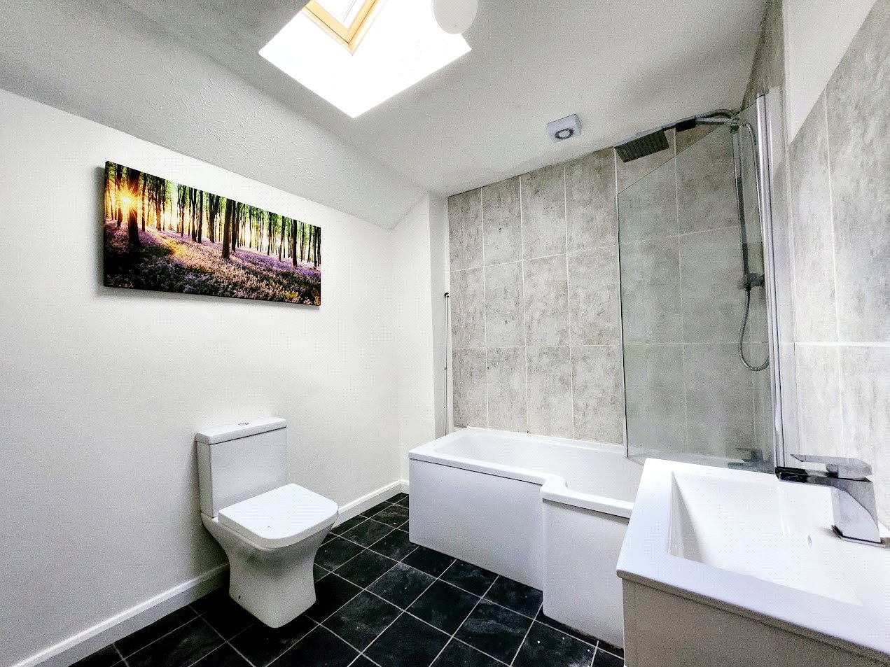 Sizeable modern bathroom suite, comprising of L-shaped bath with shower over, glass shower panel, wash hand basin with waterfall mixer tap, close-couple w/c, linoleum flooring, double-glazed Velux window, lighting and extractor fan.