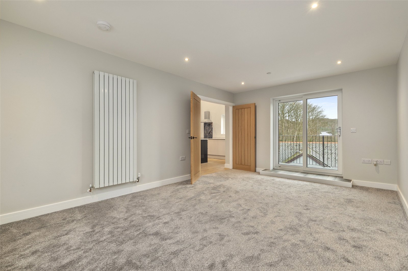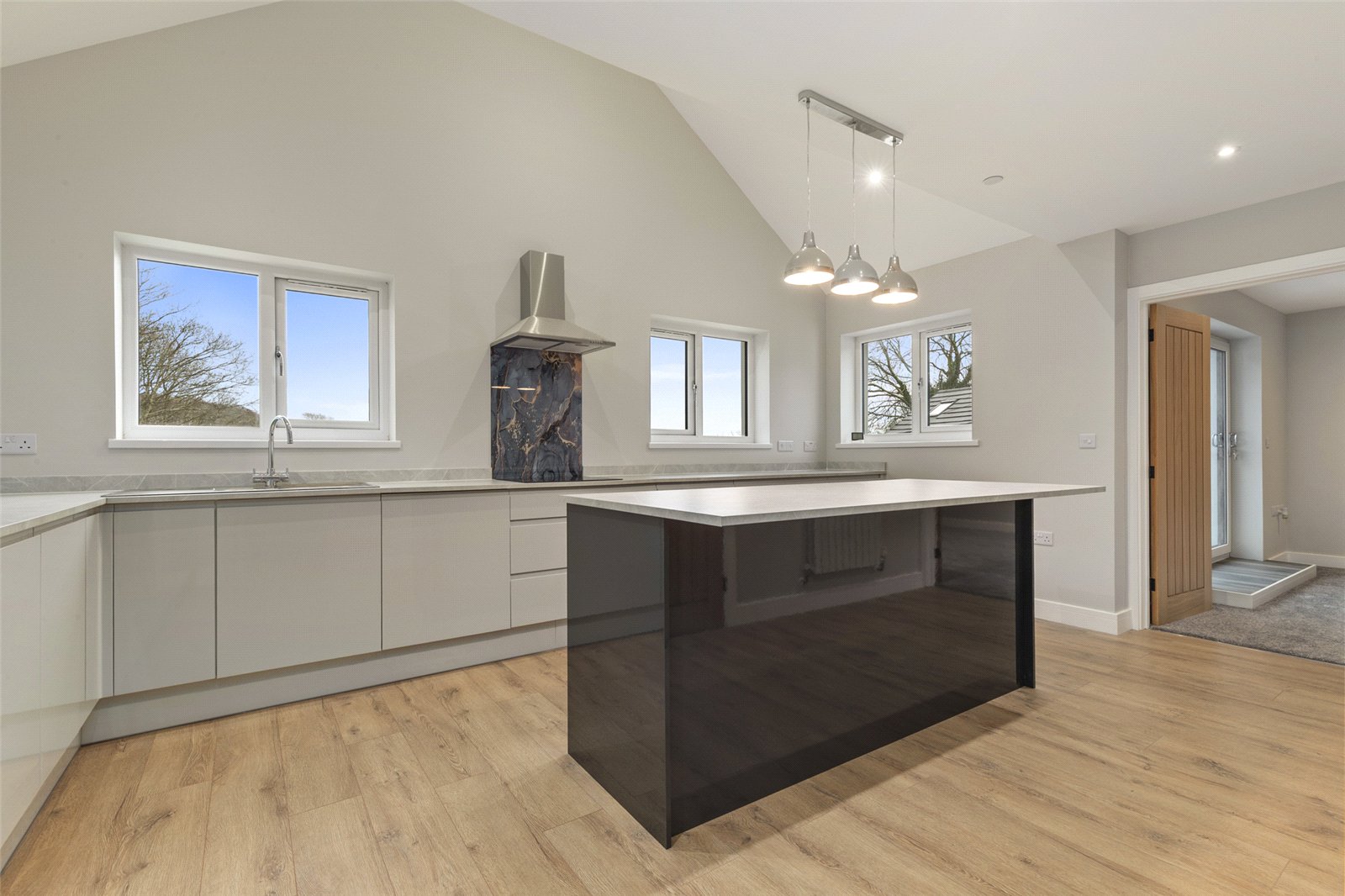 Designed in an upside-down living style to maximise the outlook, the first floor features a beautiful gallery landing leading to a modern and contemporary kitchen with integrated appliances, a large central island, and dual-aspect windows. A door leads to a utility room with side access, housing the boiler and providing additional storage.