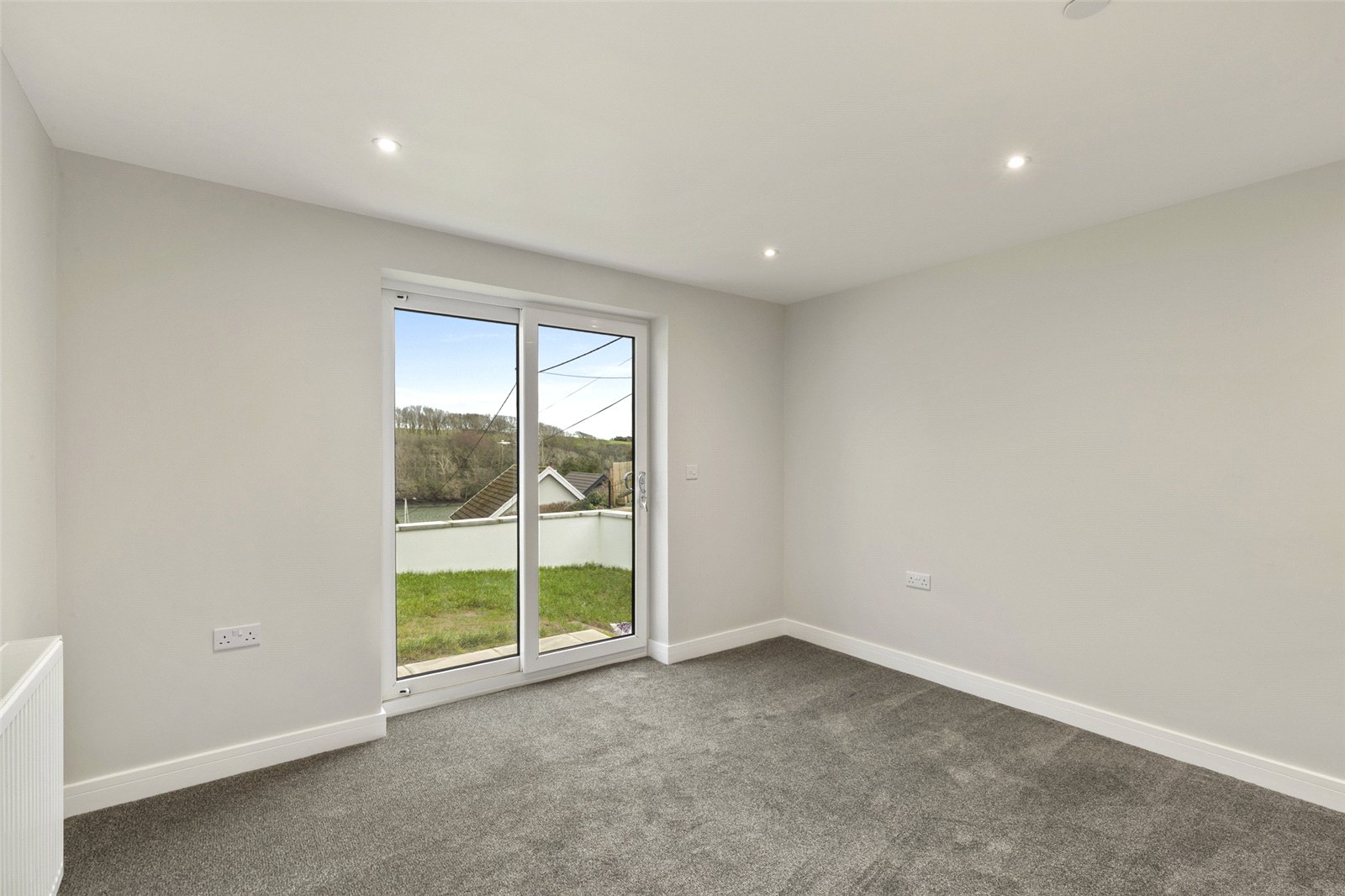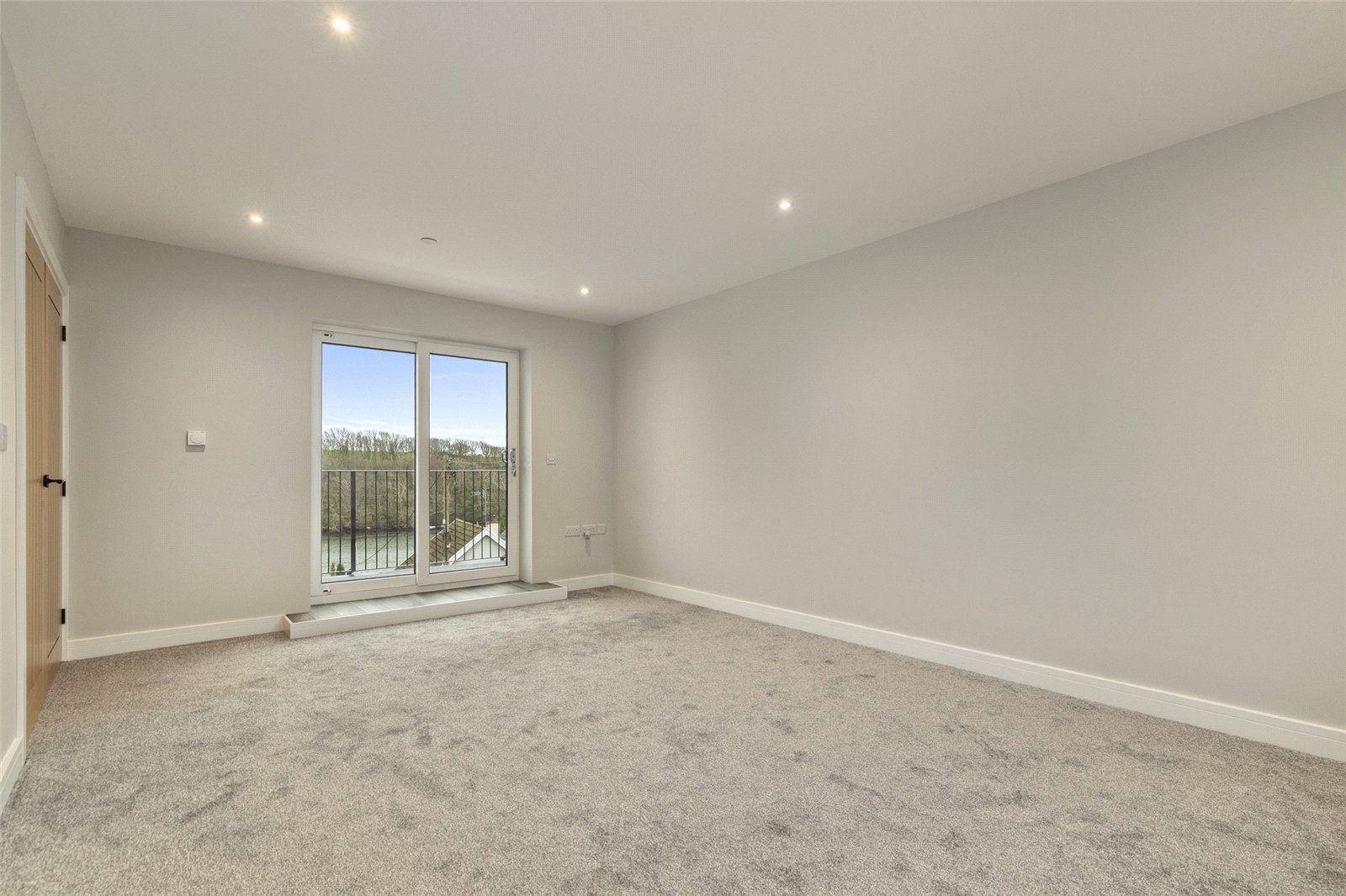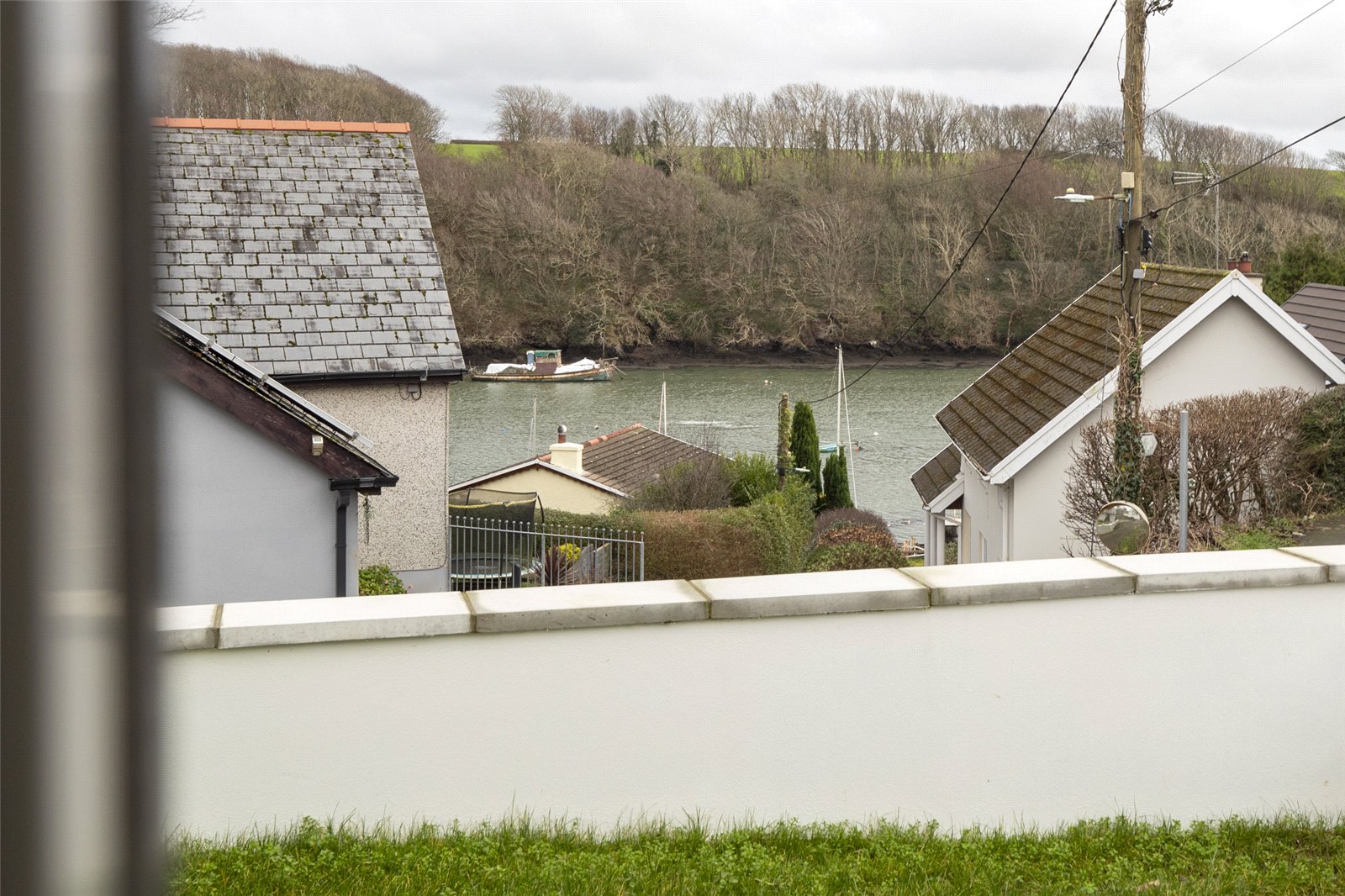 Double doors open into a spacious lounge overlooking the front, with French doors leading onto a balcony enjoying impressive water views. There is also a convenient upstairs WC.