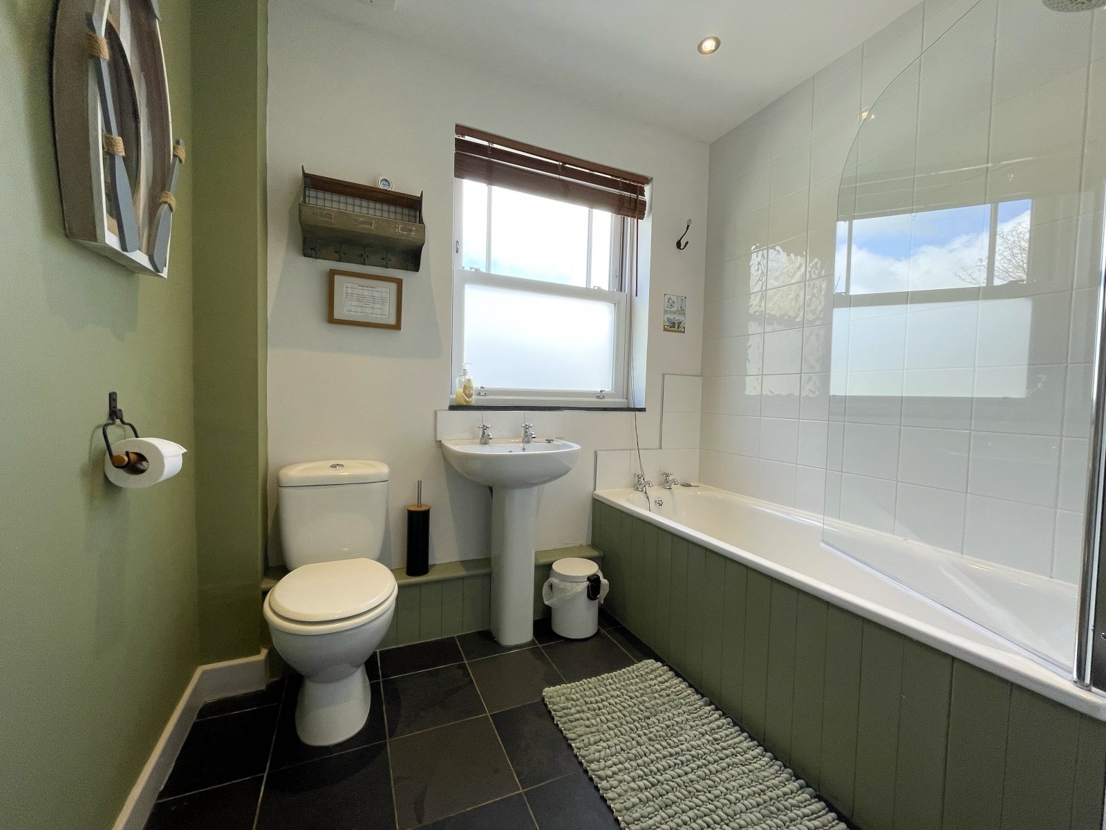 Tiled flooring, heated towel rail, WC, wash hand basin, fully tiled bath with shower over, shelving for storage, double glazed uPVC window to rear.