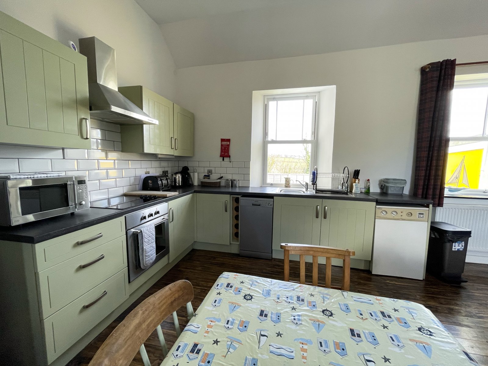 Wooden flooring, range of base and eye level units, tile splashback, sink and drainer, electric hob and oven, fridge freezer, dishwasher, 2 x double glazed uPVC windows to both the fore and rear, double glazed uPVC door to fore, 2x radiator.