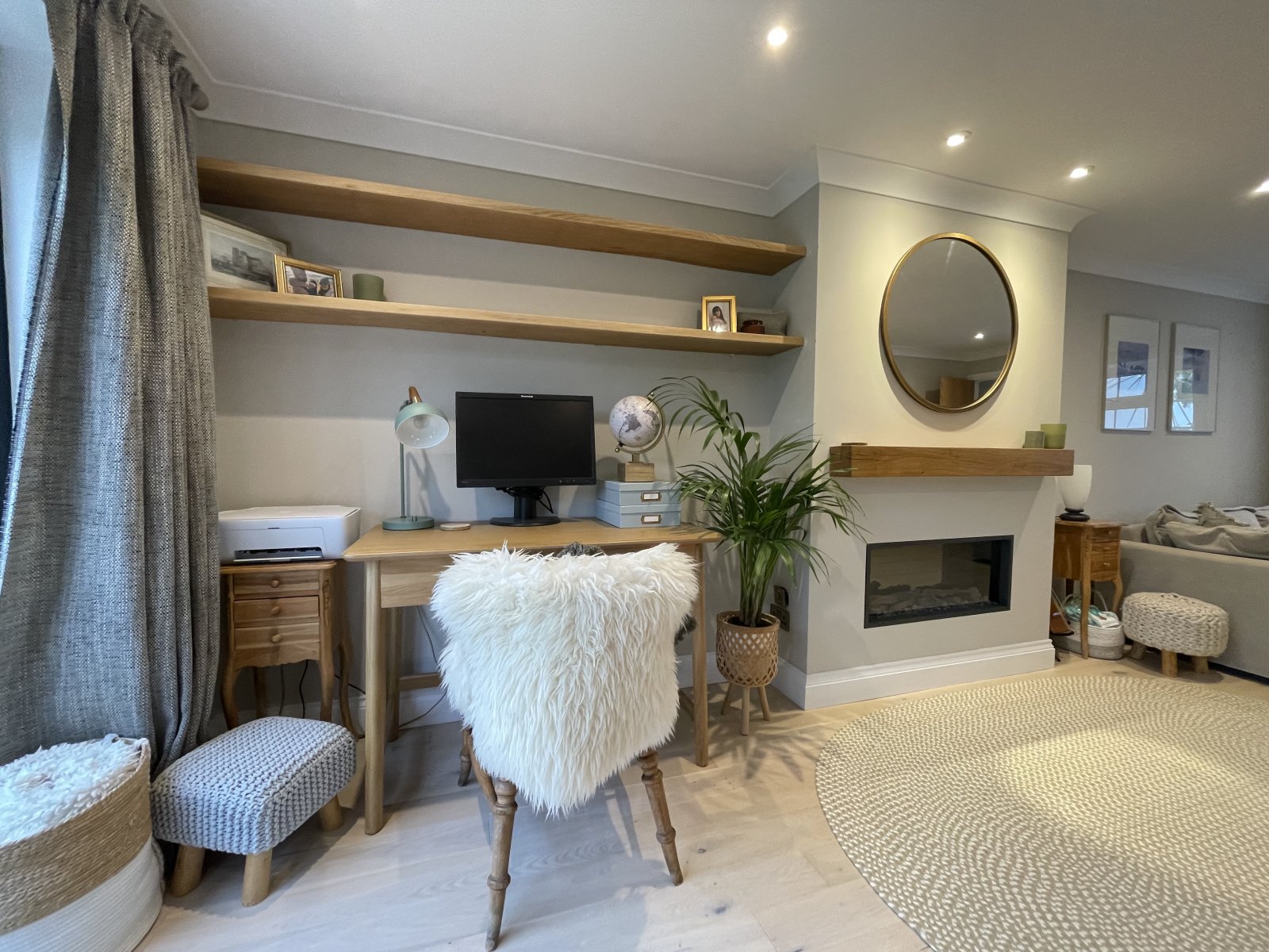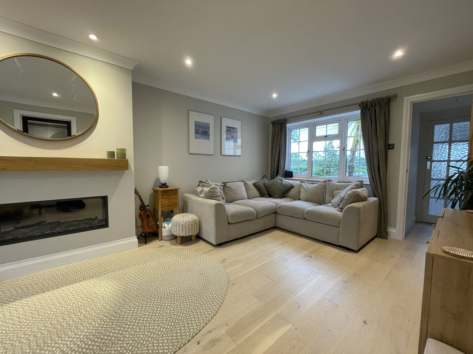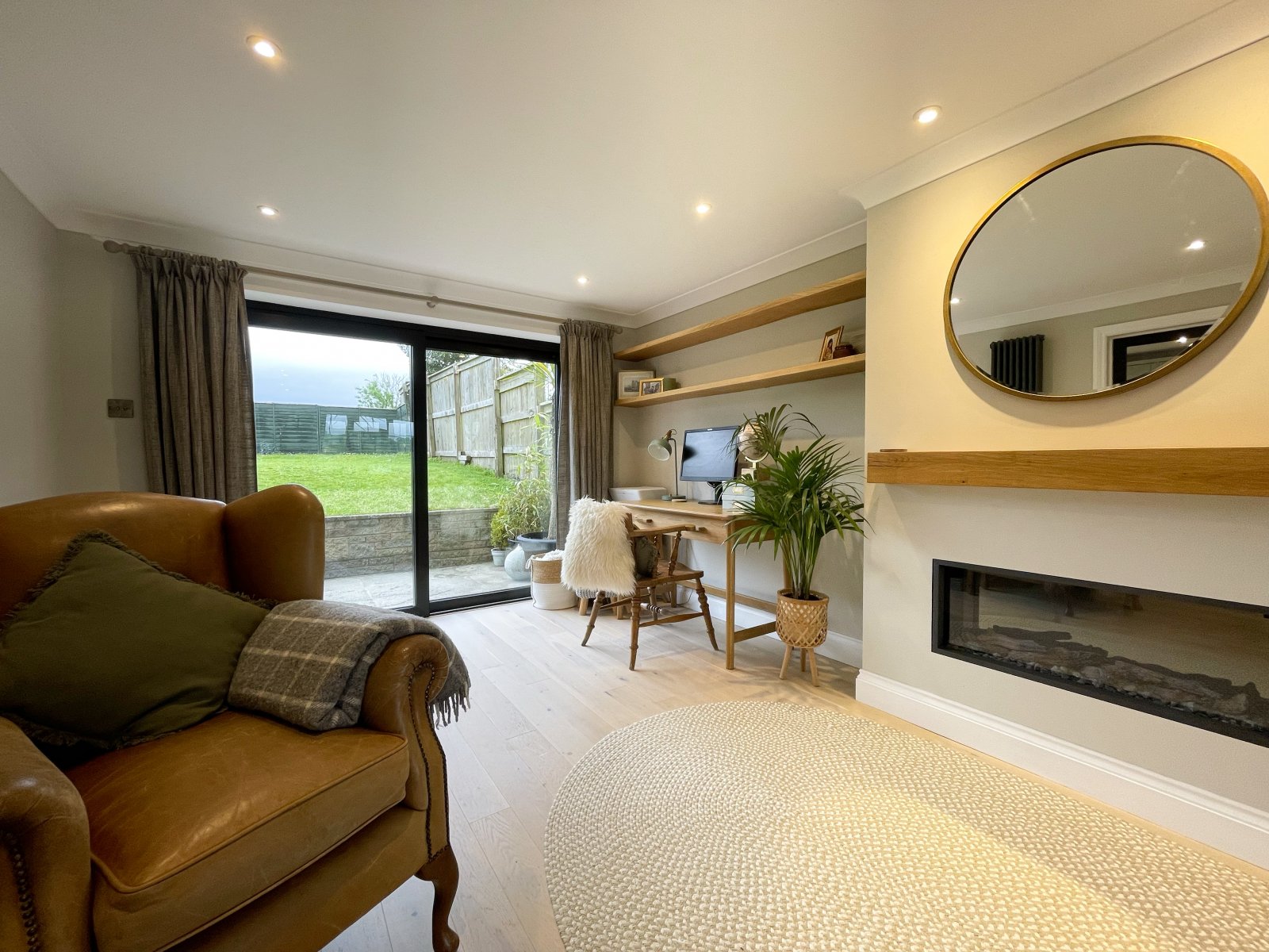 Engineered oak flooring, electric fireplace, radiator, double glazed uPVC window to fore and sliding doors to rear.