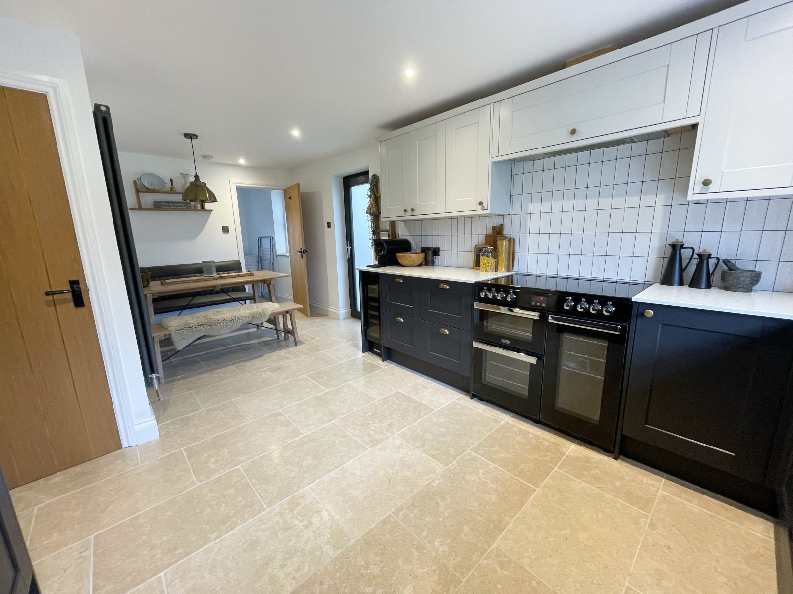 Tiled flooring, range of base and eye level units, tiled splashback, sink, integrated dishwasher, wine fridge, microwave and fridge freezer, electric oven and hob, under stairs storage cupboard, radiator, double glazed uPVC window to rear and door to side.