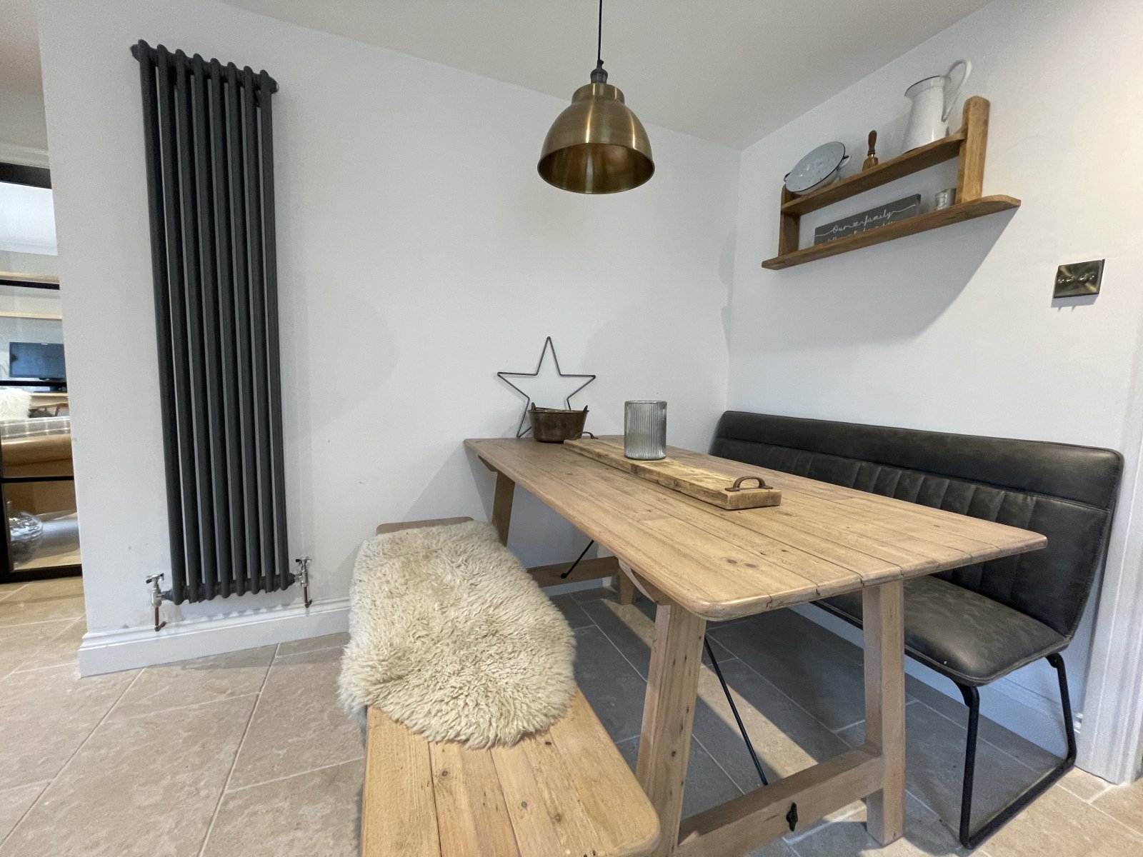 Engineered oak flooring, radiator, stairs to first floor.