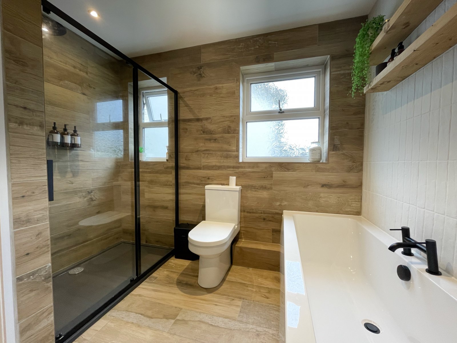 Tiled flooring, fully tiled walls, double shower, bath, WC, wash hand basin, heated towel rail, 2x uPVC windows to side.