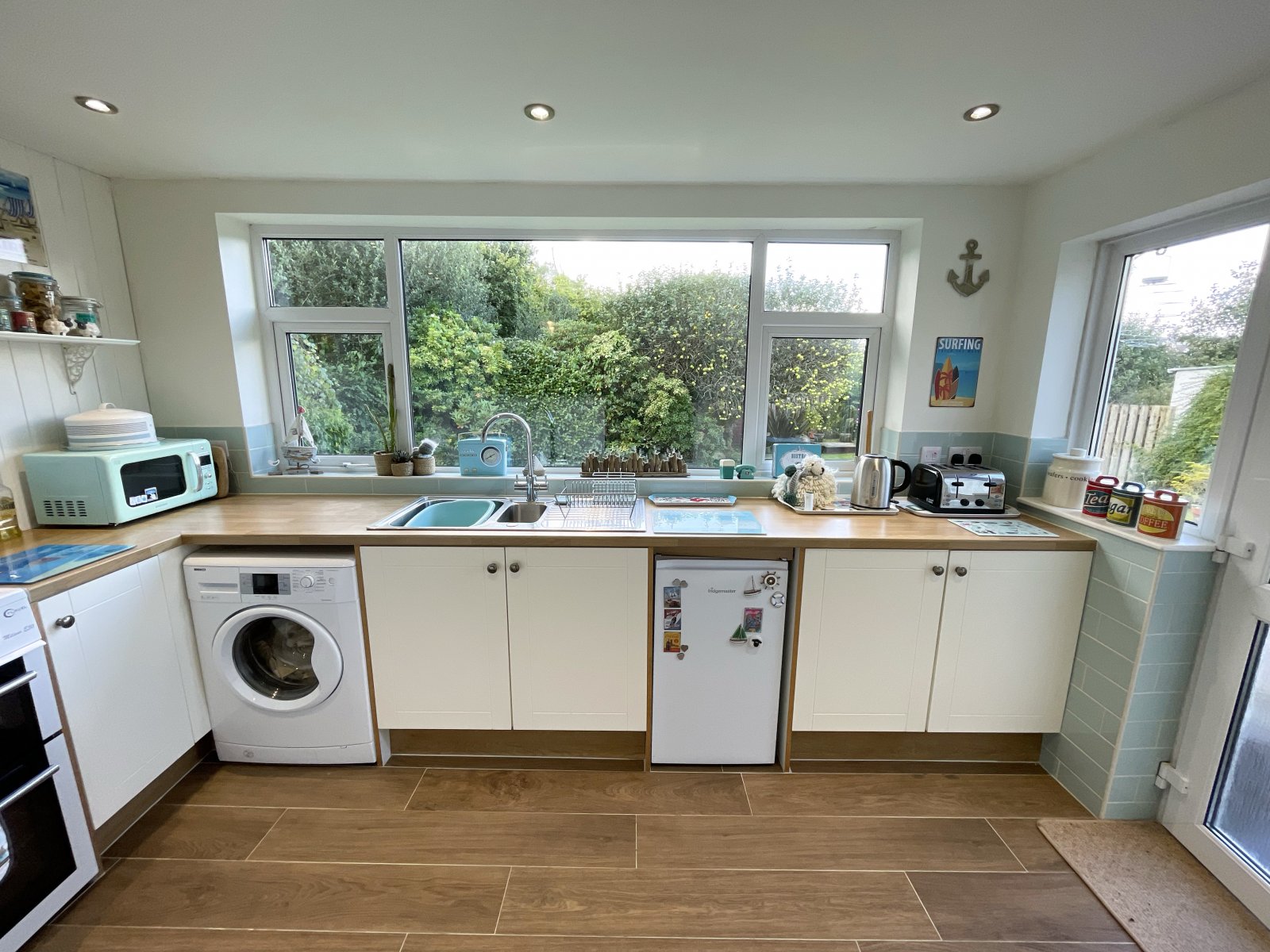 Tile flooring, range of base units, sink and drainer, tile splashback, space for cooker, washing machine and fridge freezer, double glazed uPVC window and door, radiator.