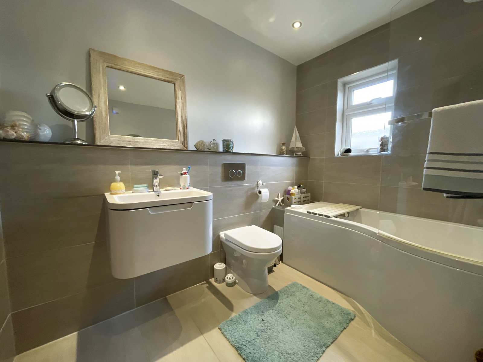 Tiled flooring and walls, WC, wash hand basin, bath with shower over, heated towel rail, double glazed uPVC window, radiator.
