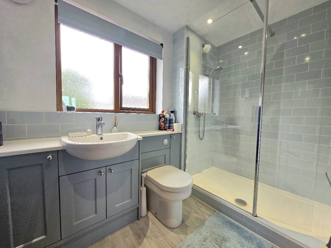 This En suite is designed with a calming, contemporary palette. The room features a walk-in shower with a sleek glass screen and light blue subway-style tiling. The floor has a wood-effect finish, providing a warm contrast to the cooler tones of the walls. A light grey vanity unit with a white countertop houses a basin and provides storage, with a toilet neatly positioned beside it. A large window fitted with a blind allows for plenty of natural light.