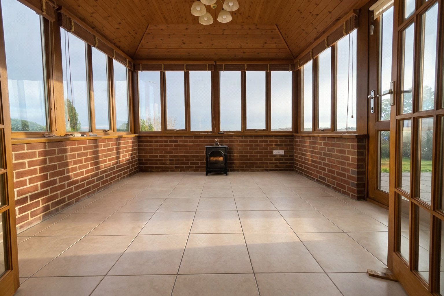 This charming conservatory provides a bright and inviting space with a rustic feel. The room features a striking combination of exposed brick walls and a sloped, wood-paneled ceiling, creating a warm, cozy atmosphere. An abundance of natural light streams in through multiple windows, each fitted with wooden blinds, offering panoramic views of the surrounding landscape. The room is floored with large, neutral-toned ceramic tiles, and includes a log-effect stove for added warmth. Access to the outdoors is provided by a glazed door, while an internal set of double doors connects the conservatory to the rest of the property.