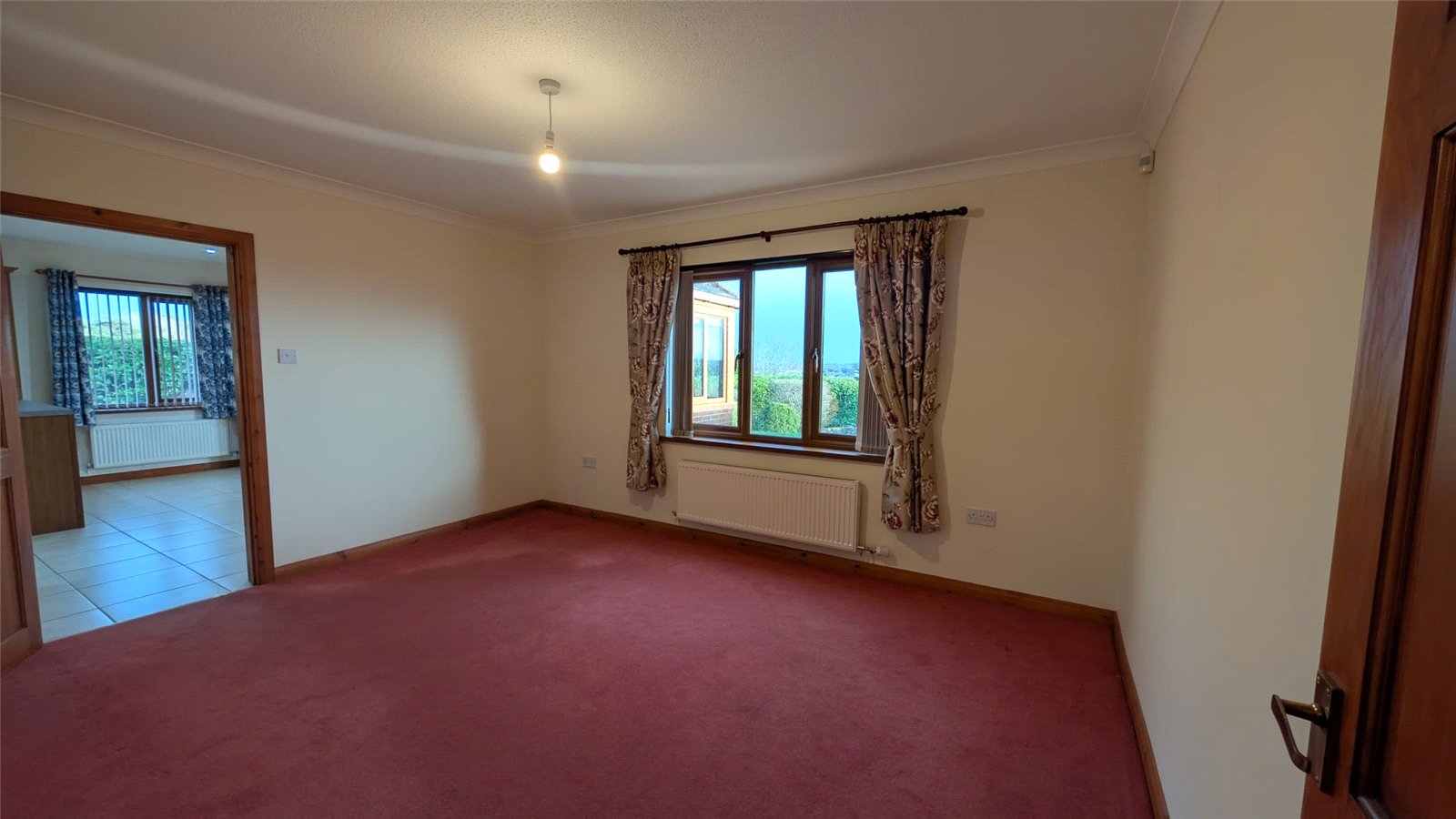 This double bedroom is an adaptable space with neutral cream walls and a contrasting blue carpet. The room benefits from a good amount of natural light from a window with a radiator below. Access to the room is through a classic wooden door, and it includes a built-in storage area. The space is currently minimally furnished, offering a blank canvas for personalization.