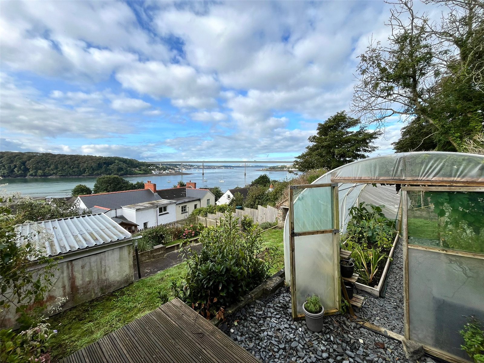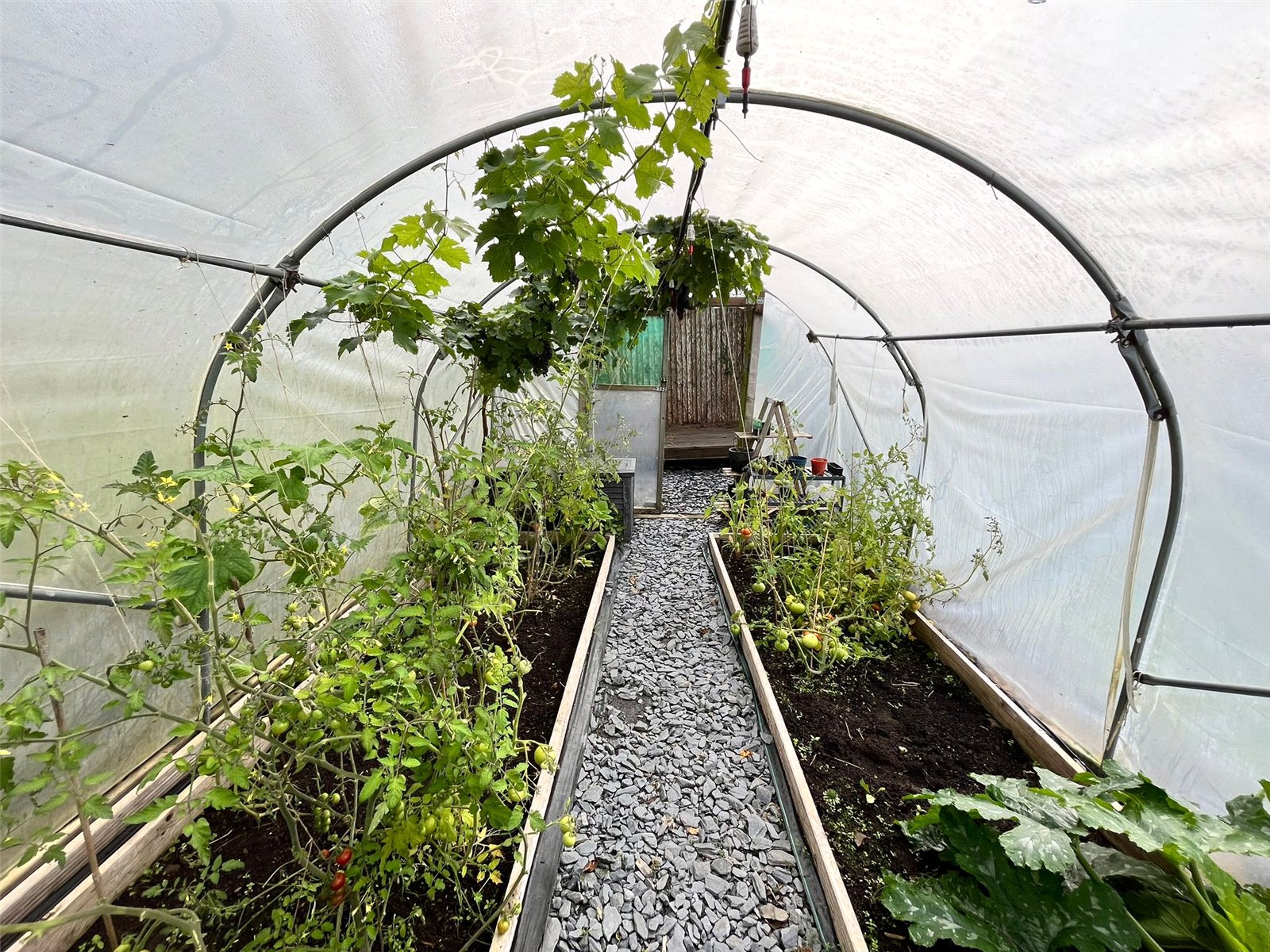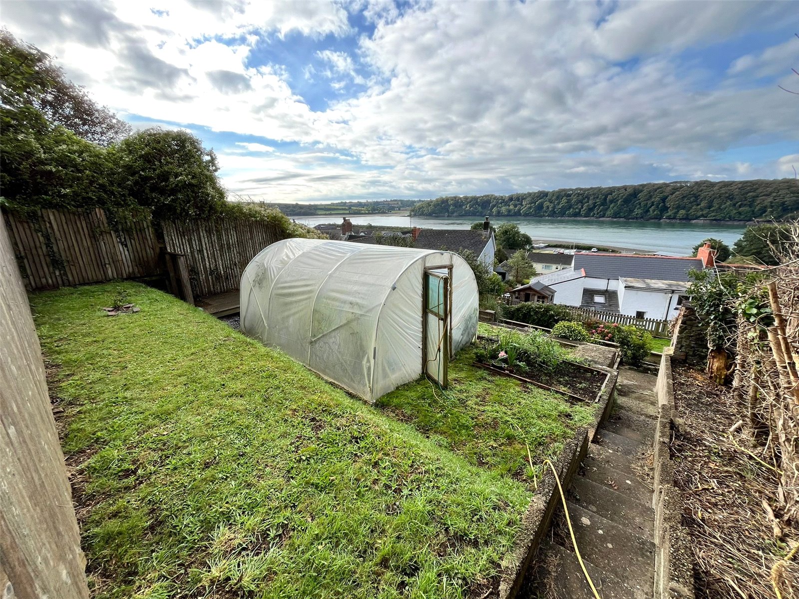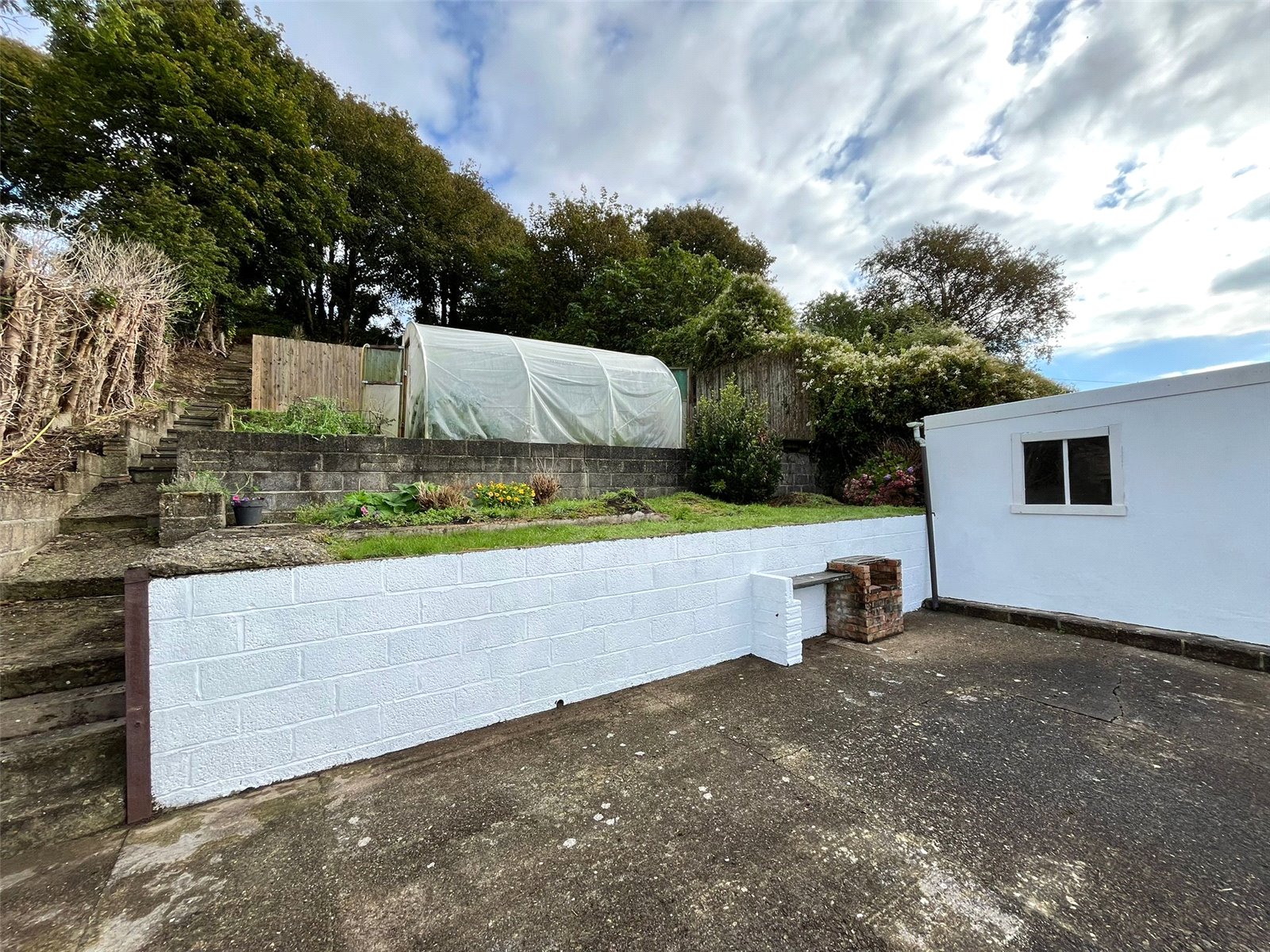 The gentle slope of the lawned steps invites you to explore the tiered garden with its exceptional sea views. At the bottom, a sturdy wood store hints at the joys of gardening. A solid poly tunnel promises an early harvest, no matter the weather. Nearby, a well-built outbuilding offers additional storage space. And finally, a charming patio with raised beds awaits, perfect for relaxing and enjoying the fire pit in this fully enclosed garden.