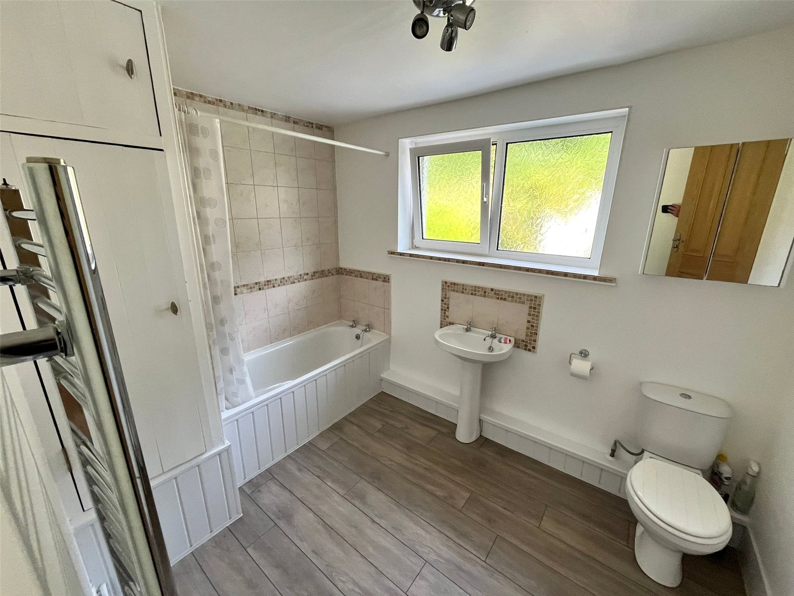 Composite flooring, W.C, hand wash basin with separate taps, bath with separate taps, with electric shower above, uPVC double glazed window to the rear with obscure glass, extractor fan, spot lighting, heated towel rail, airing cupboard.