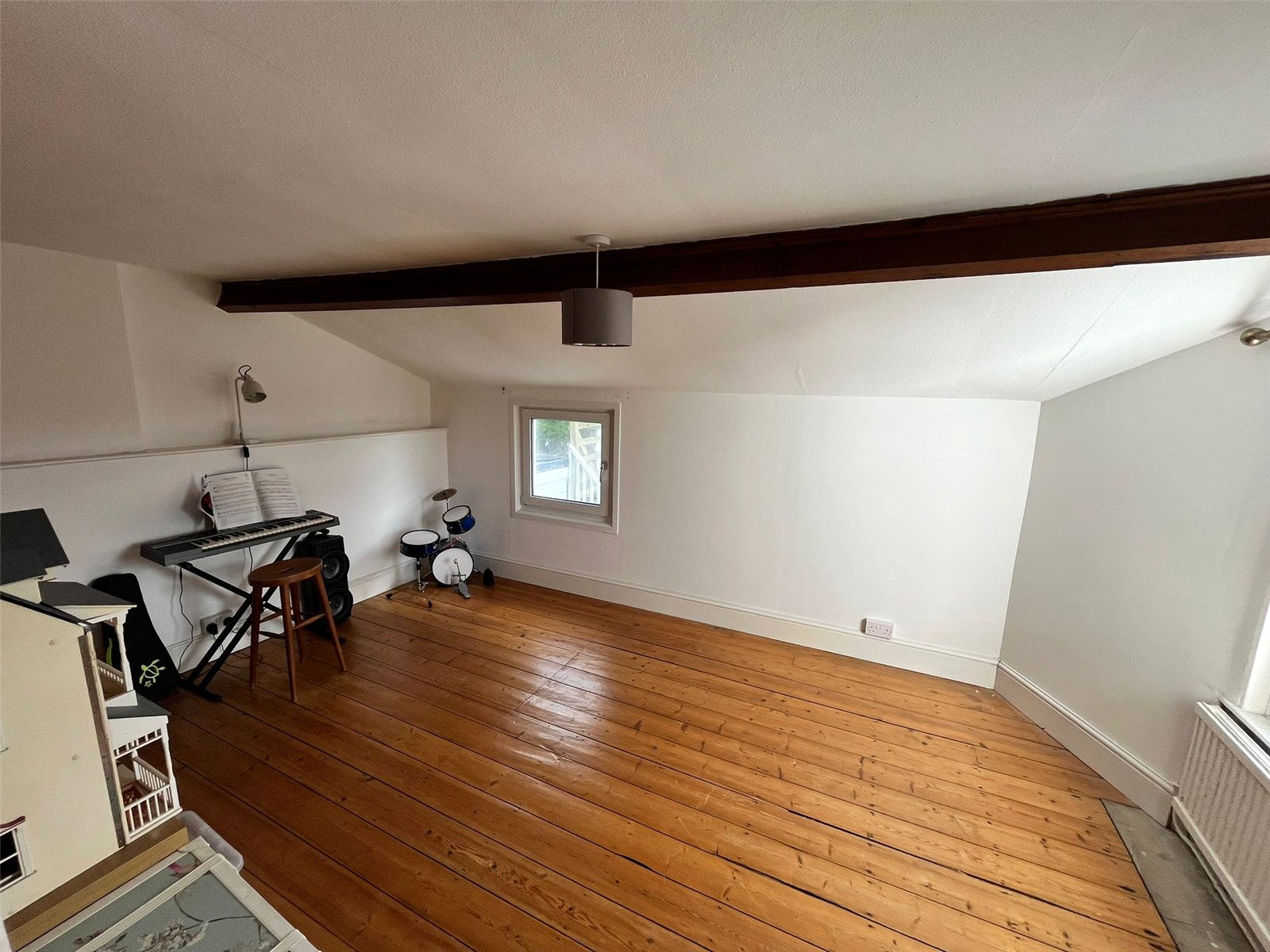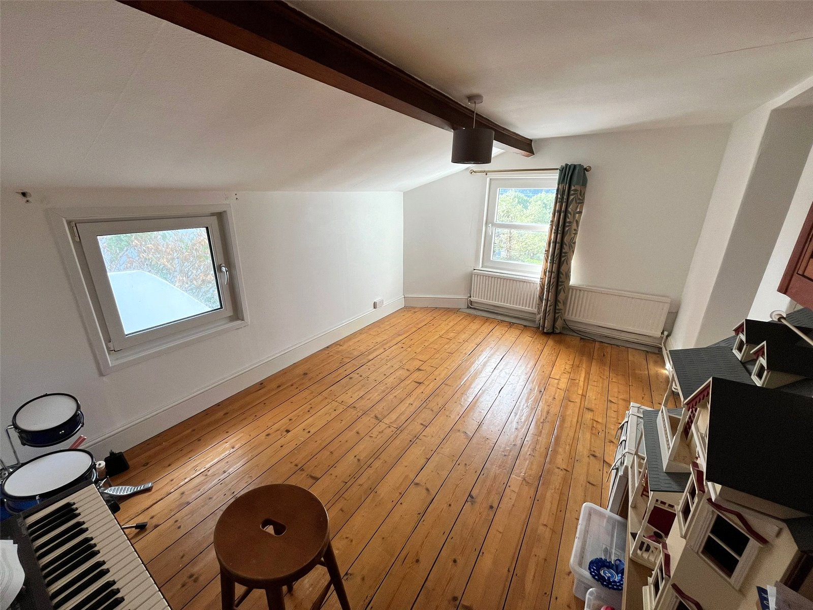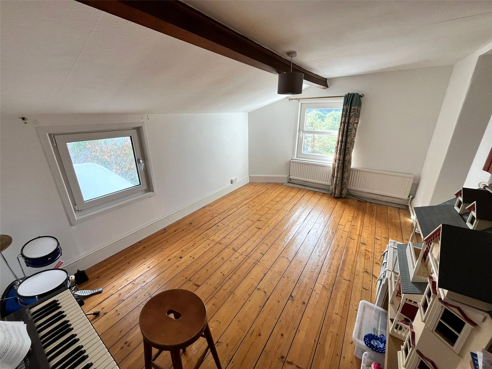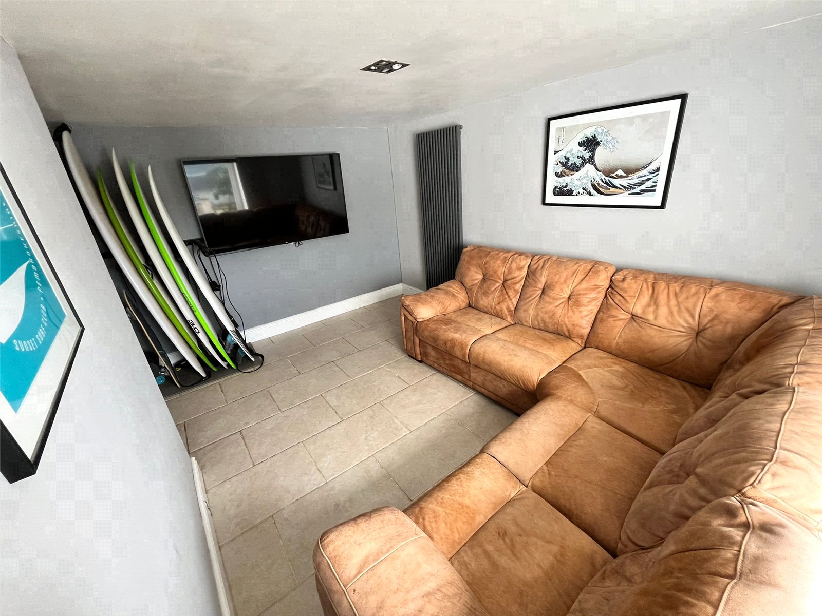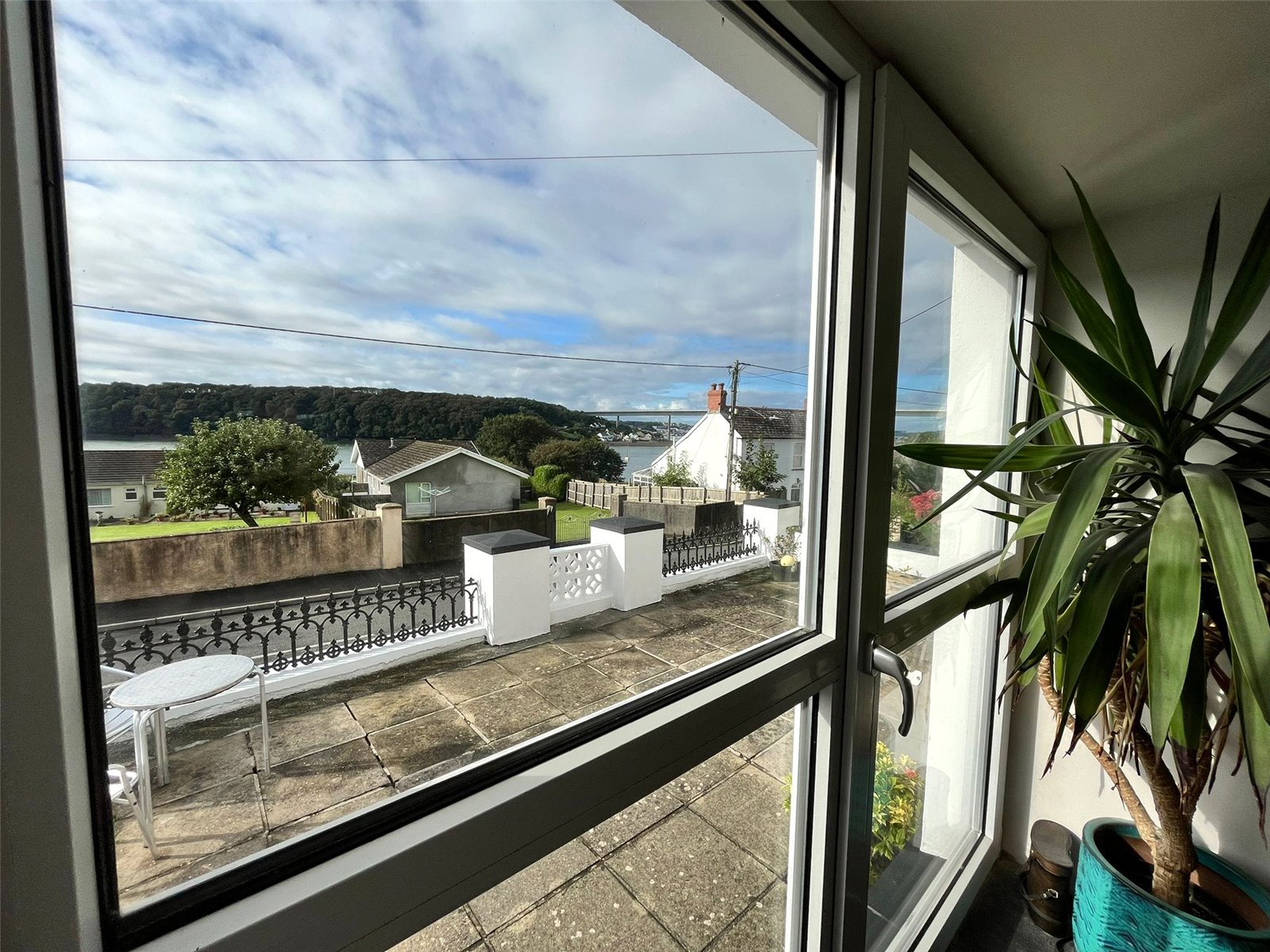 uPVC double glazed window to the fore with coastal views, radiator, light fitting, wooden flooring.