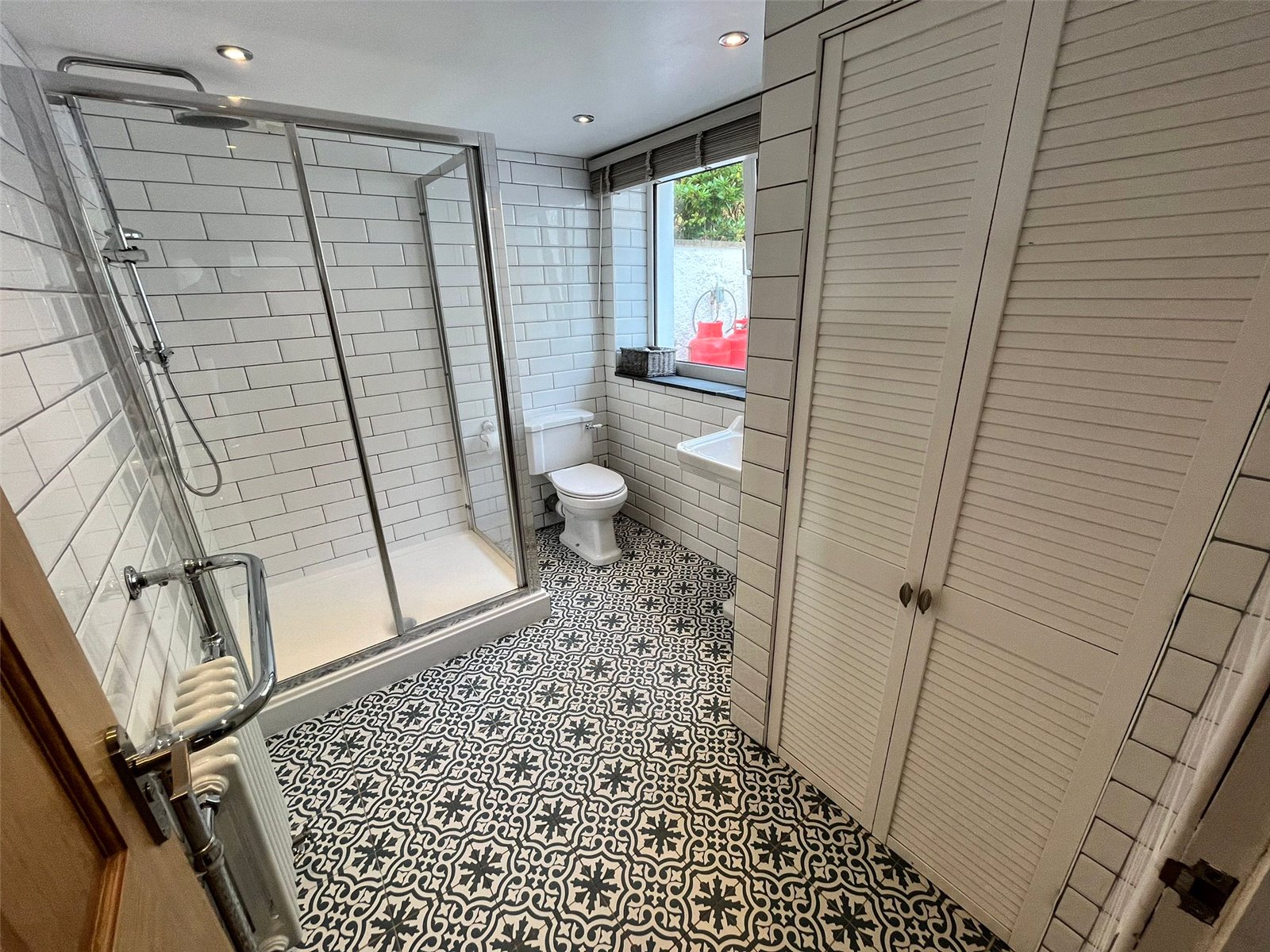 Tilled walls throughout, tilled flooring, double space shower, W.C, hand wash basin with separate taps, double glazed uPVC window, spot lighting, towel rail, airing cupboard.
