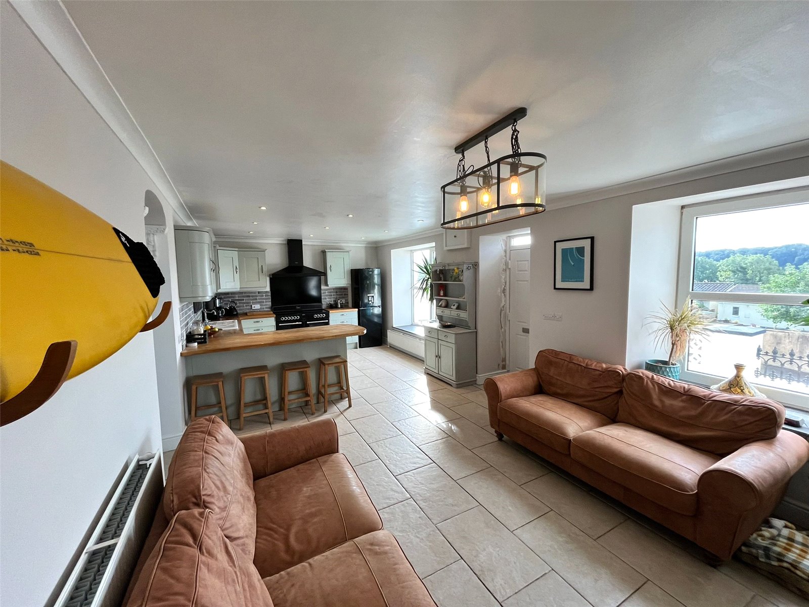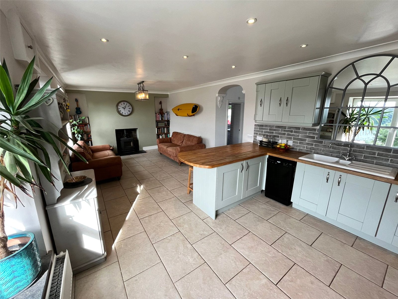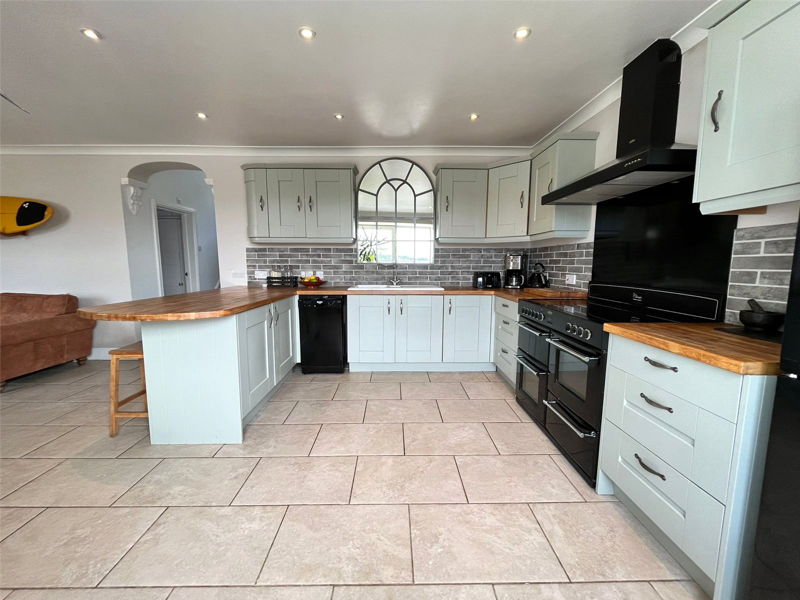 Two uPVC double gazed windows to the fore with views of the estuary, low level radiator, range of solid wood base and wall units, double oven with extractor and lighting above, space for fridge freezer, tiled splash back, spot lighting, dishwasher, 1.5 ceramic sink with mixer tap, tiled floor, Wood burner, recess shelving, radiator, Three drop light fitting,