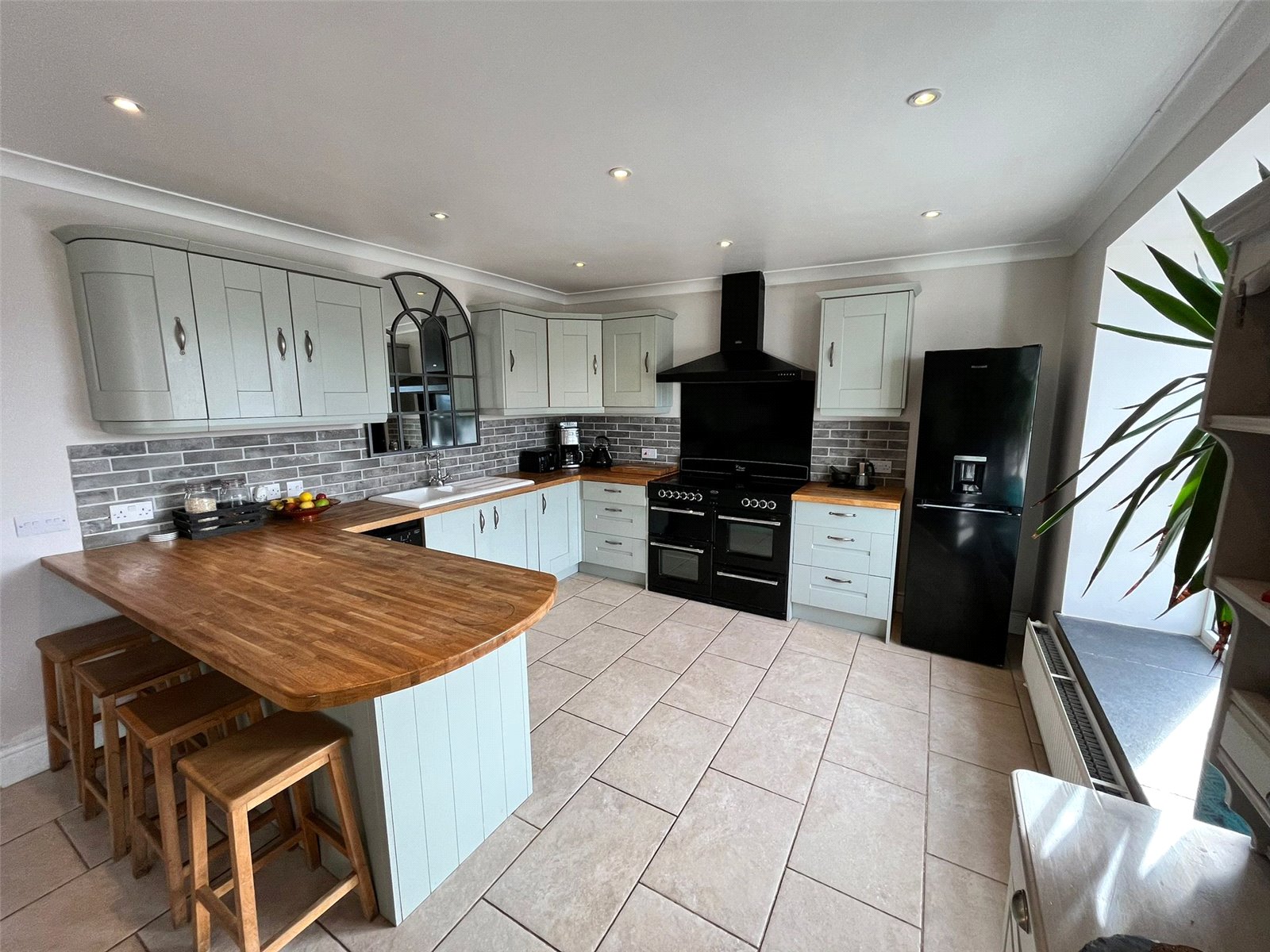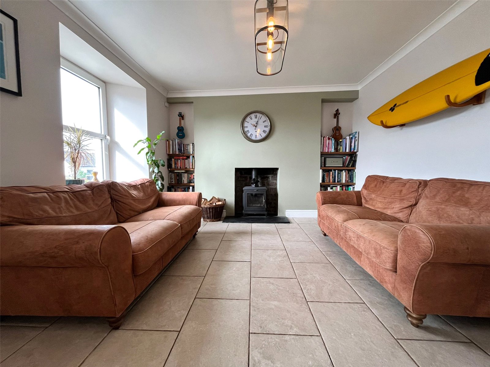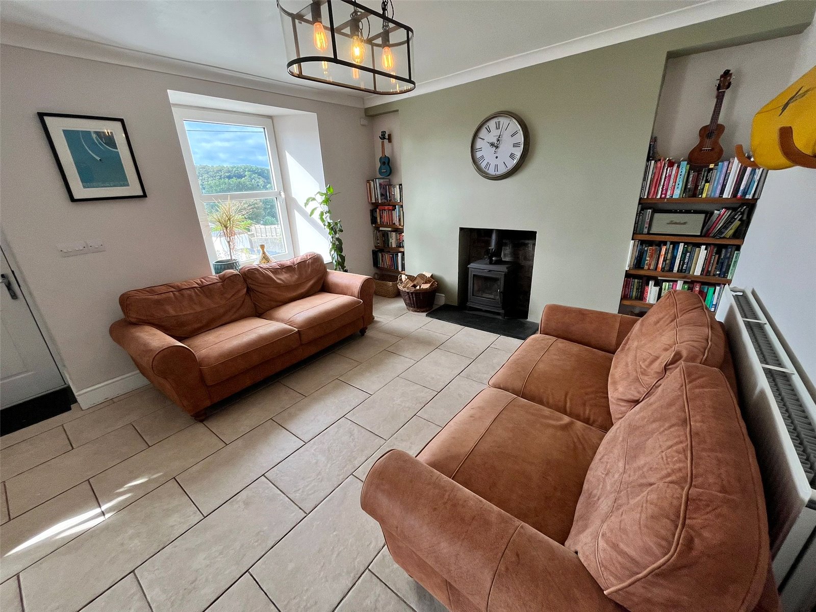 Two uPVC double gazed windows to the fore with views of the estuary, low level radiator, range of solid wood base and wall units, double oven with extractor and lighting above, space for fridge freezer, tiled splash back, spot lighting, dishwasher, 1.5 ceramic sink with mixer tap, tiled floor, Wood burner, recess shelving, radiator, Three drop light fitting,