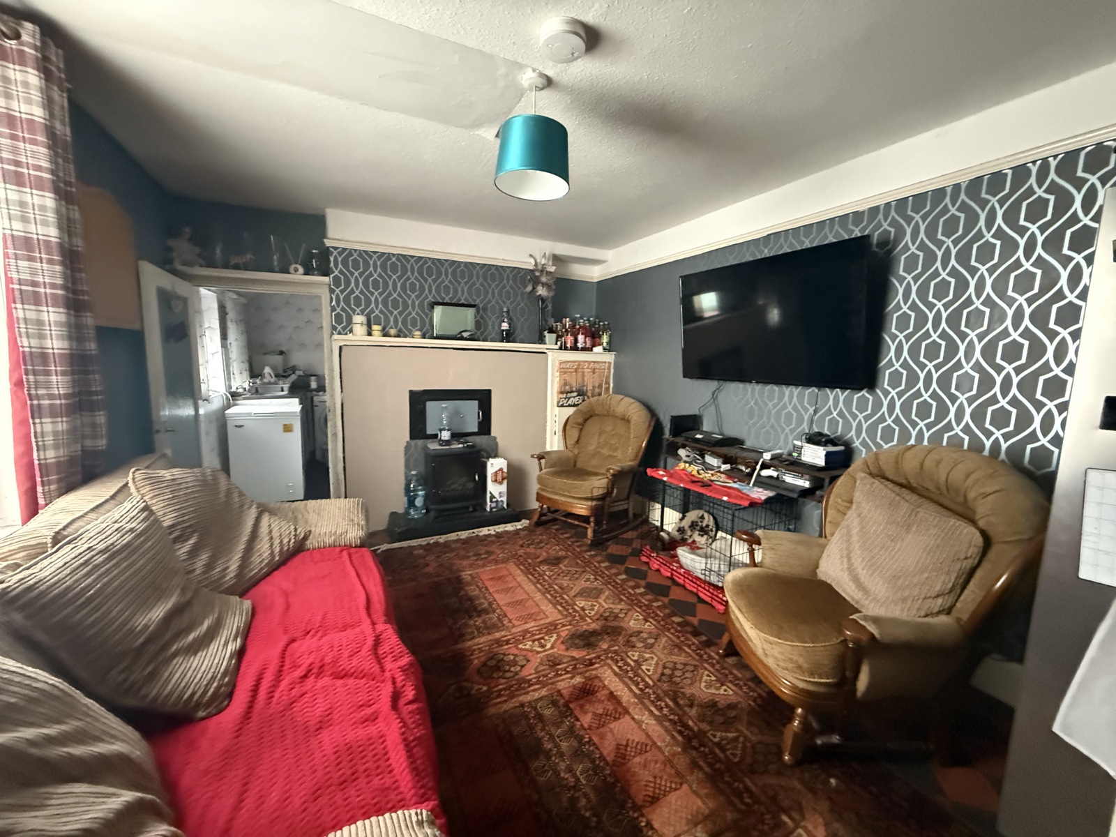 UPVC double glazed window to side, black and red quarry tiles, original Victorian fire, door to kitchen