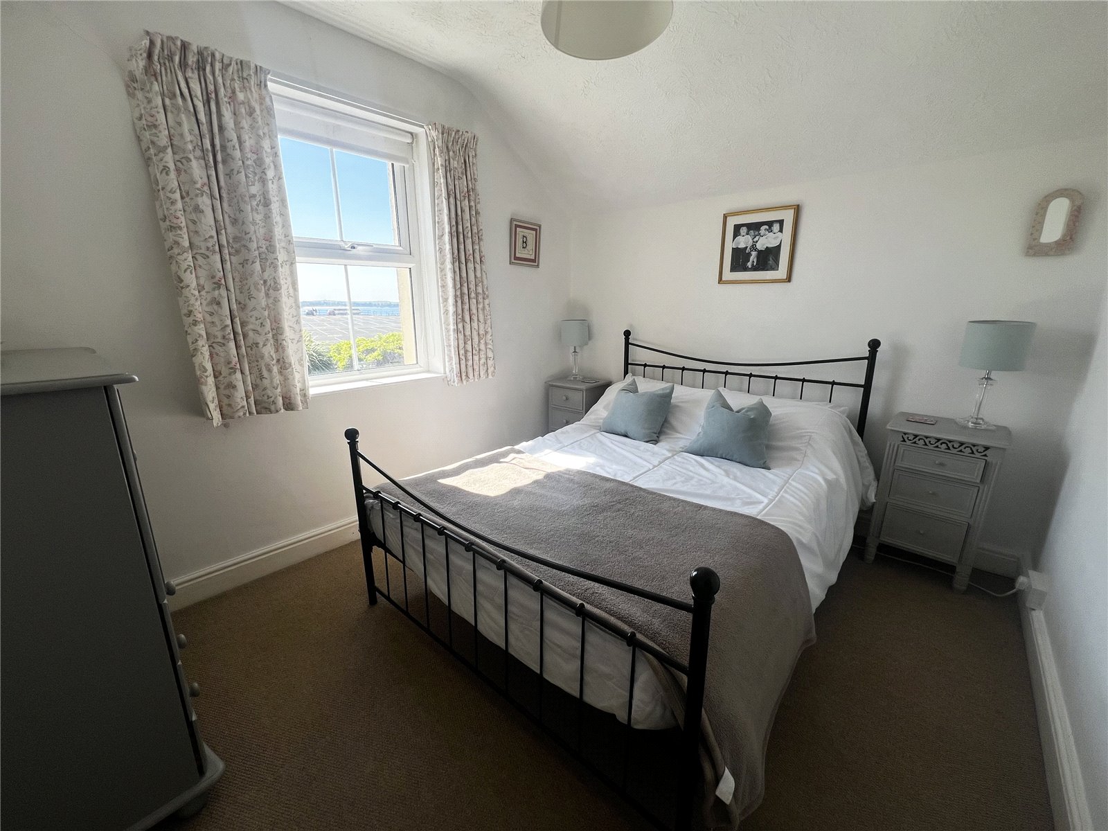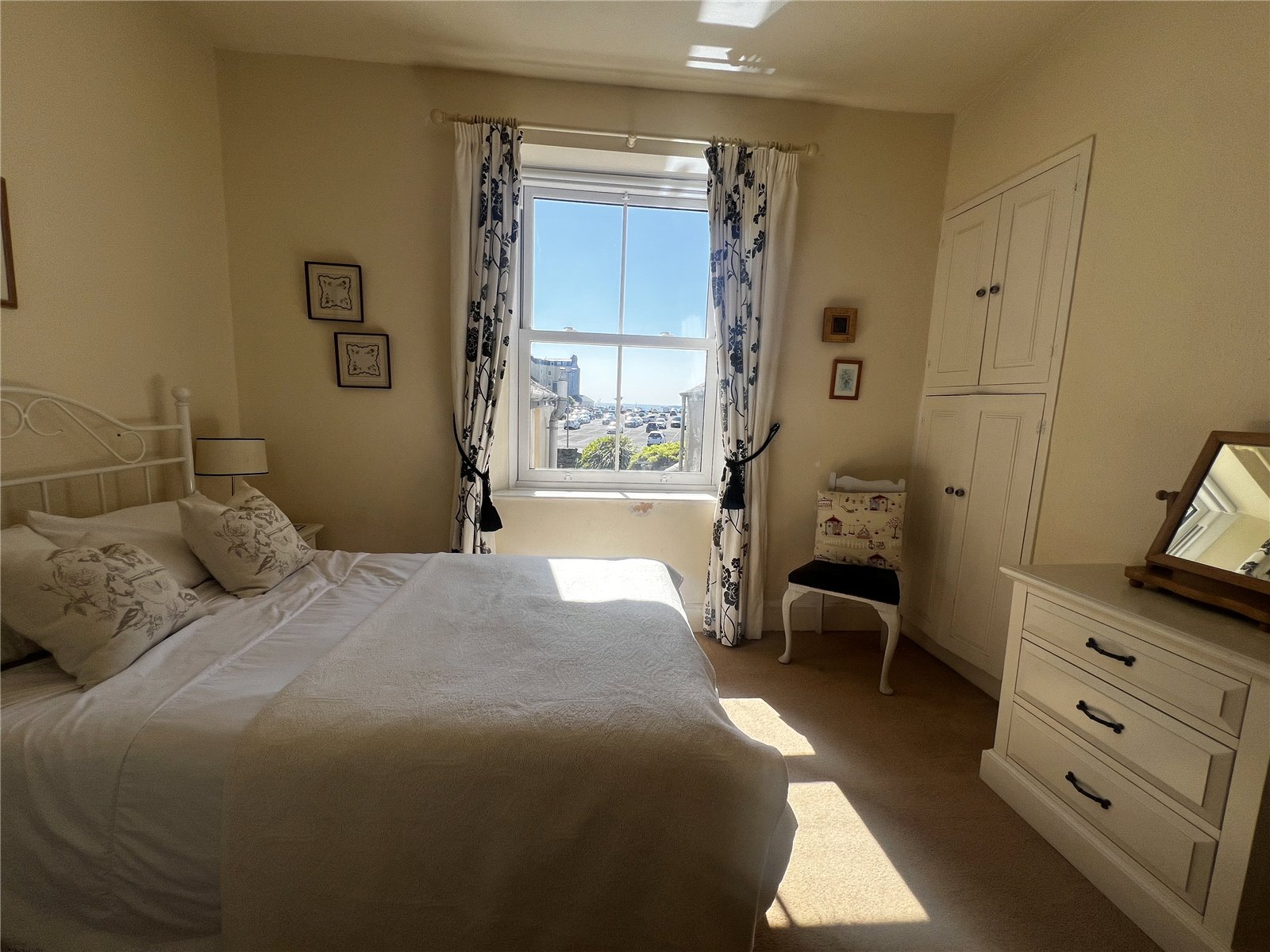 This carpeted bedroom features built-in storage, a double glazed sash window offering stunning sea views towards Caldey Island, and a radiator for added comfort. An interconnecting door provides access to Bedroom 2.