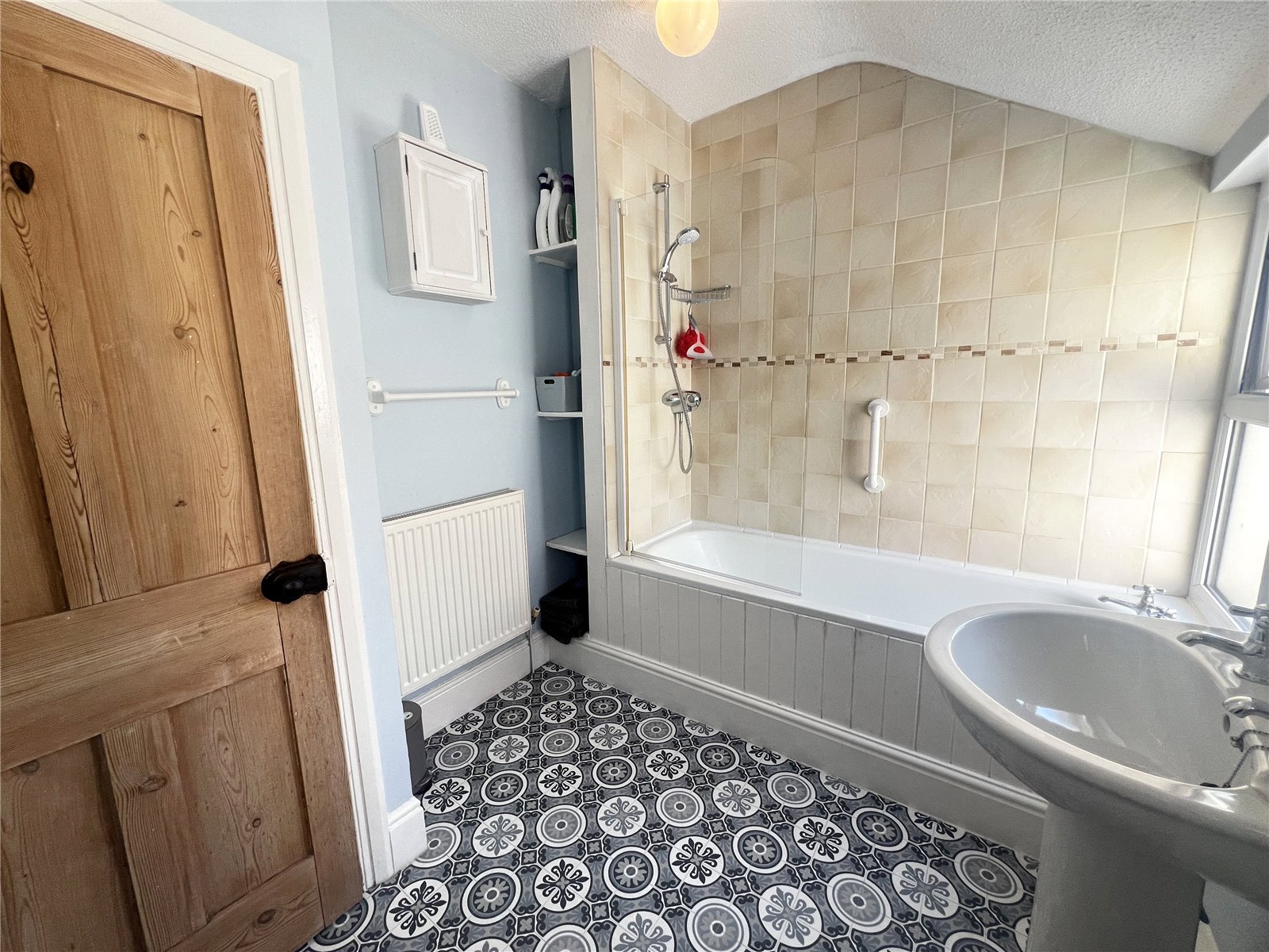 A well-appointed bathroom with tiled flooring, featuring a bathtub with an overhead shower, WC, and a wall and base mounted wash-hand basin. The room is completed with a radiator and two double glazed frosted windows.