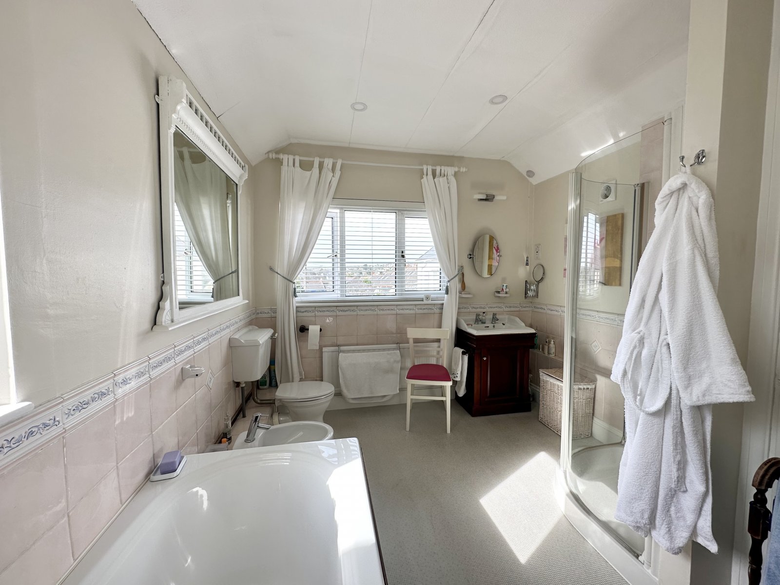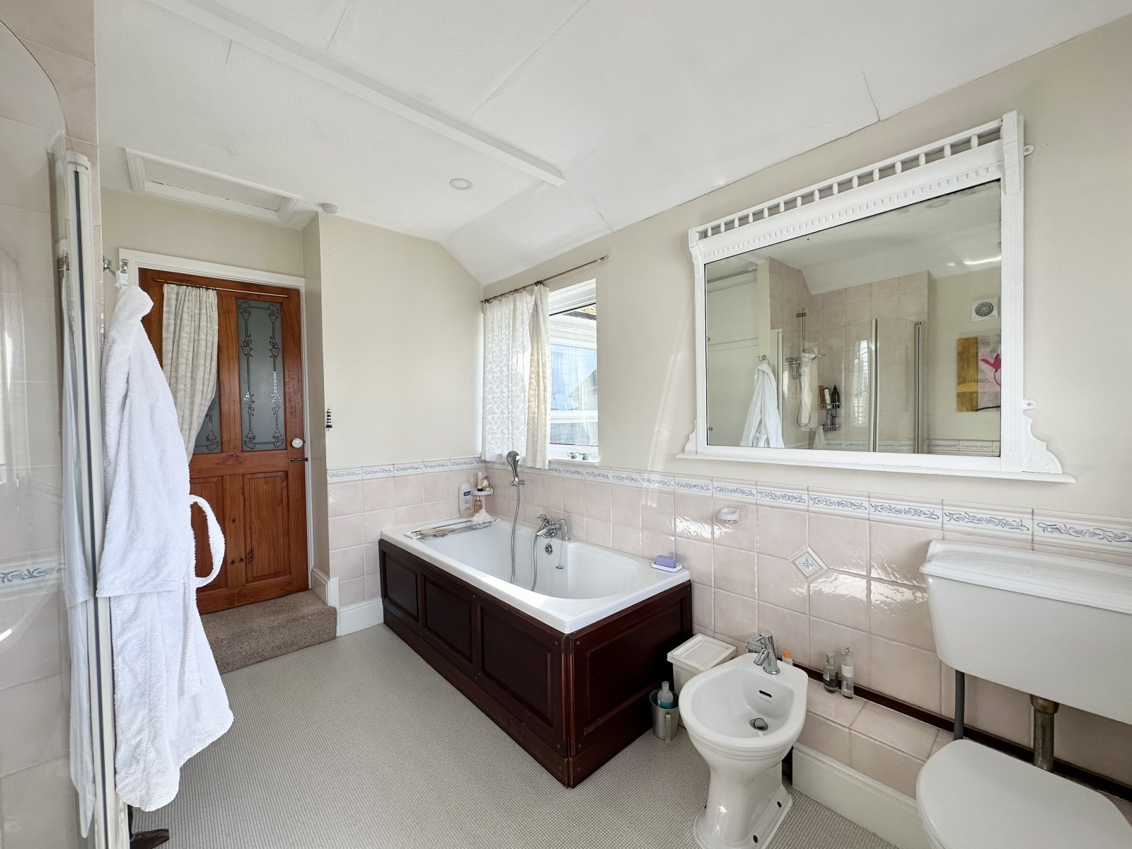 Tiled flooring, double glazed window to side and rear, ceiling light, heated towel rail, W.C, wash hand basin, shower unit, bath unit.