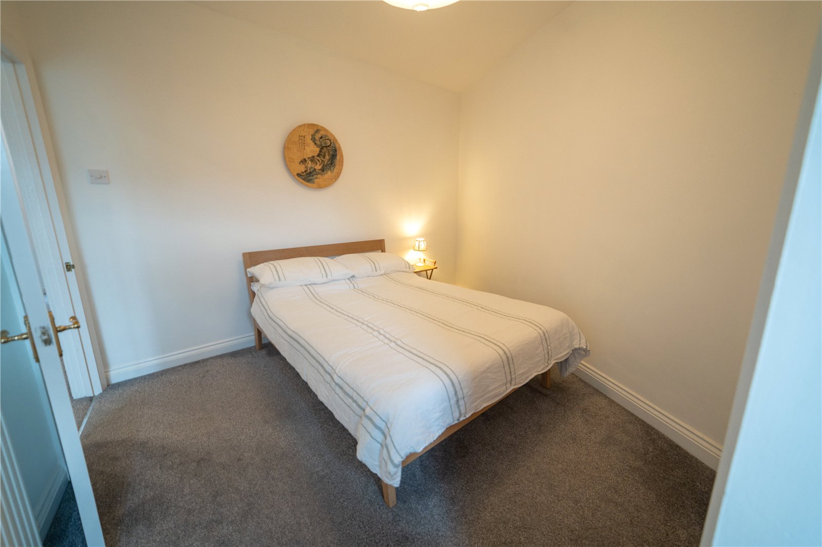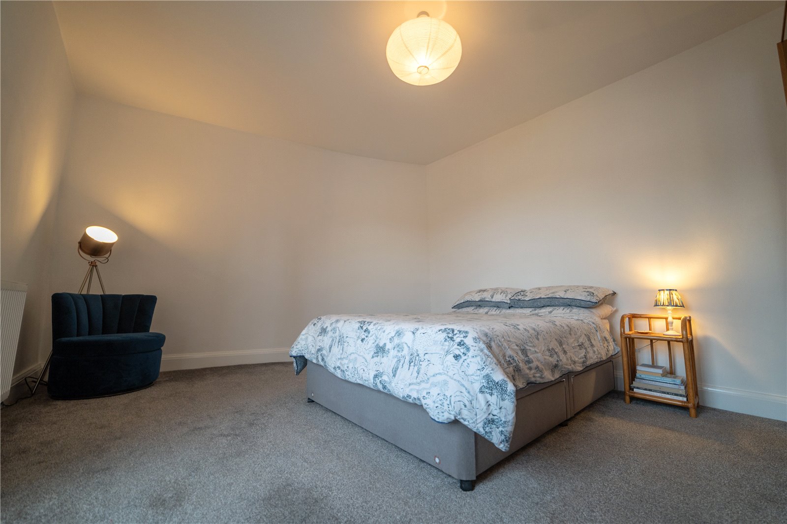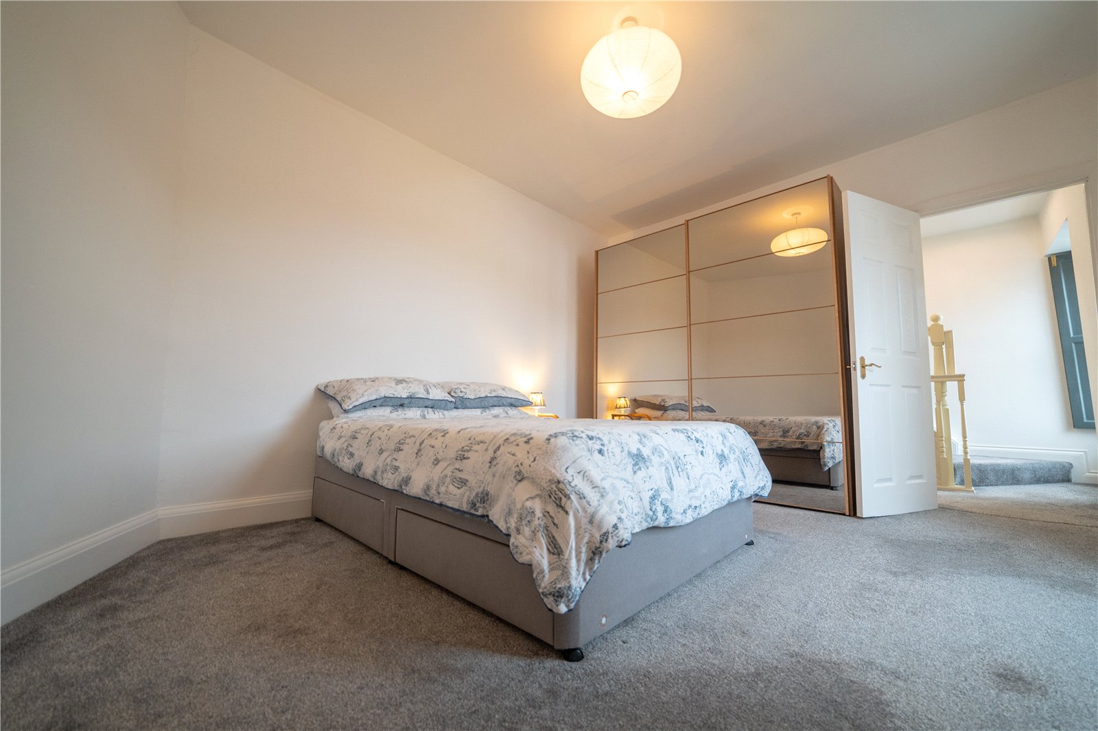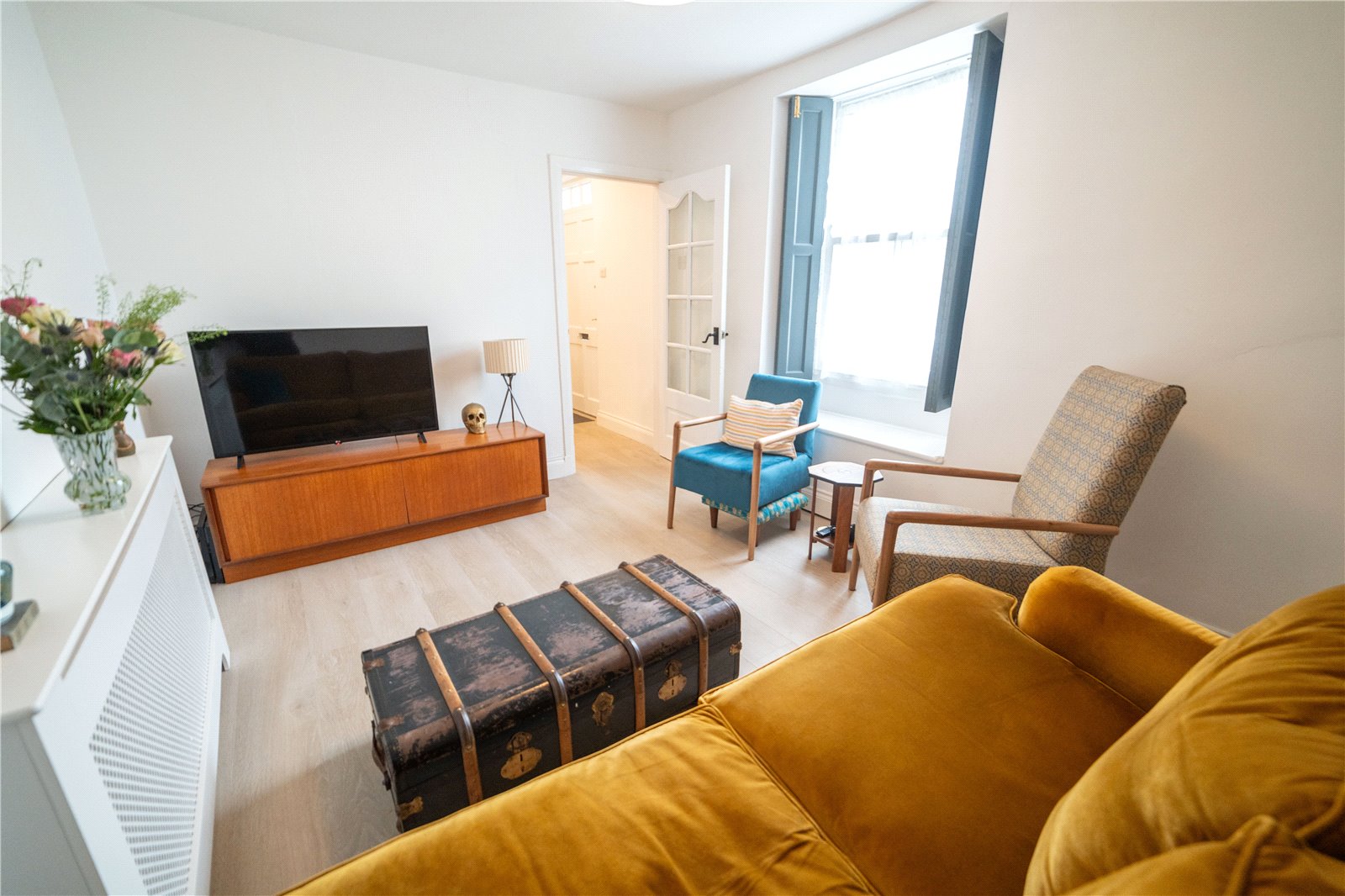 Carpeted flooring, wooden single glazed sash window with traditional wooden shutters overlooking the front of the property.