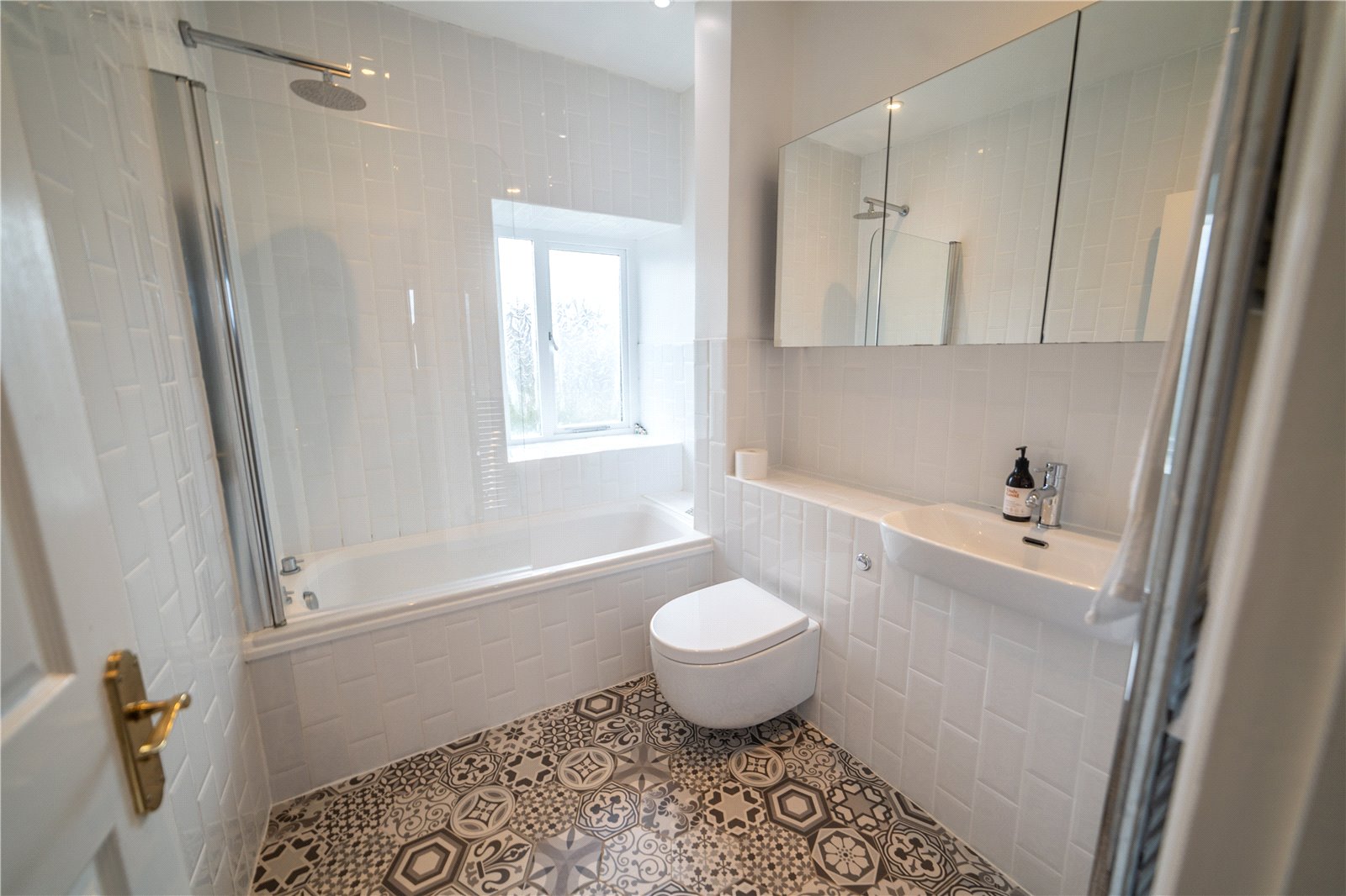 patterned hexagon porcelain tiled flooring, WC, wash hand basin, large triple mirrored wall hung cabinet providing ample space for toiletries lending a clean spa-like feel, bath with a powerful overhead shower, obscured wooden single glazed window overlooking rear garden.