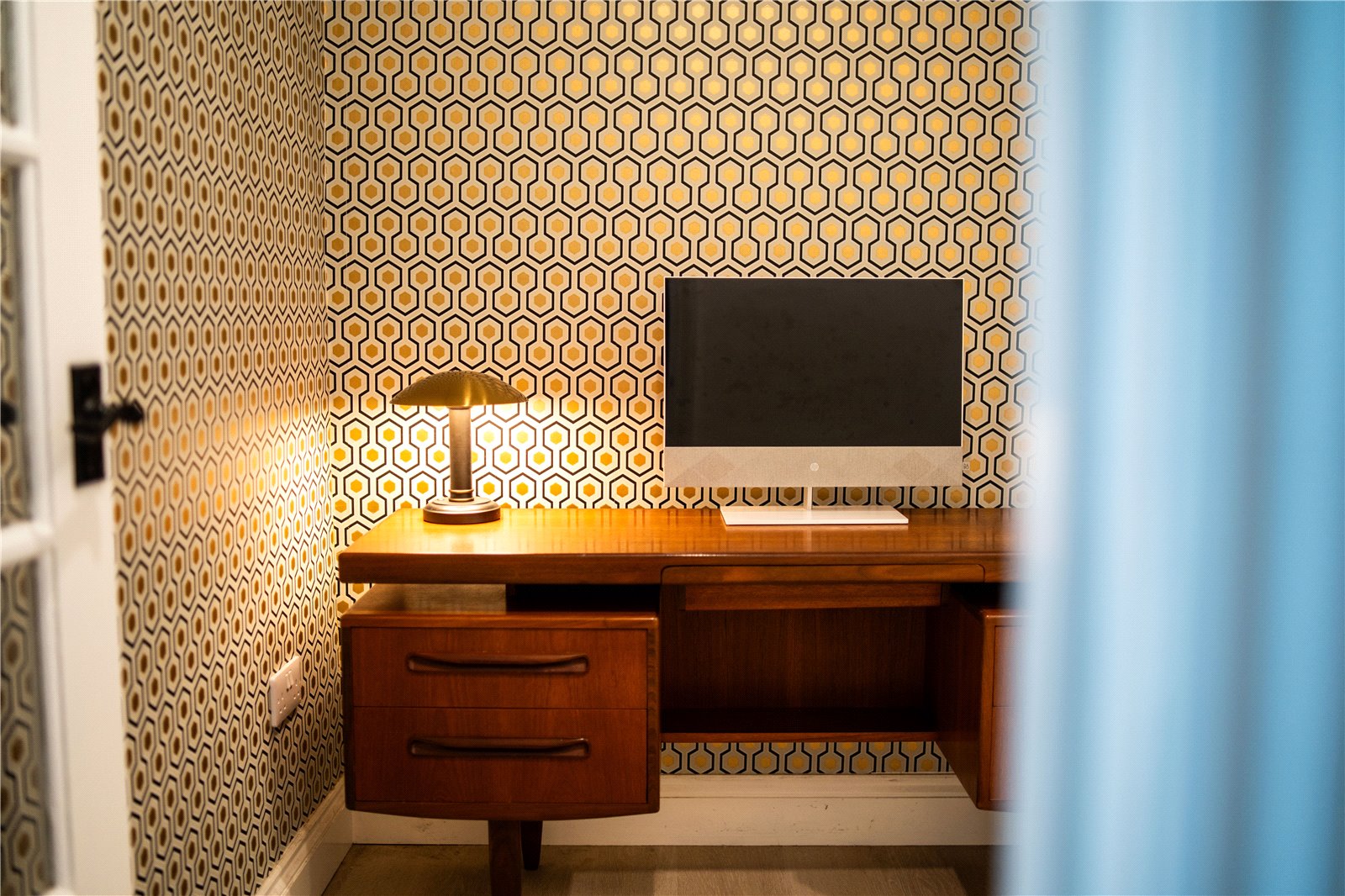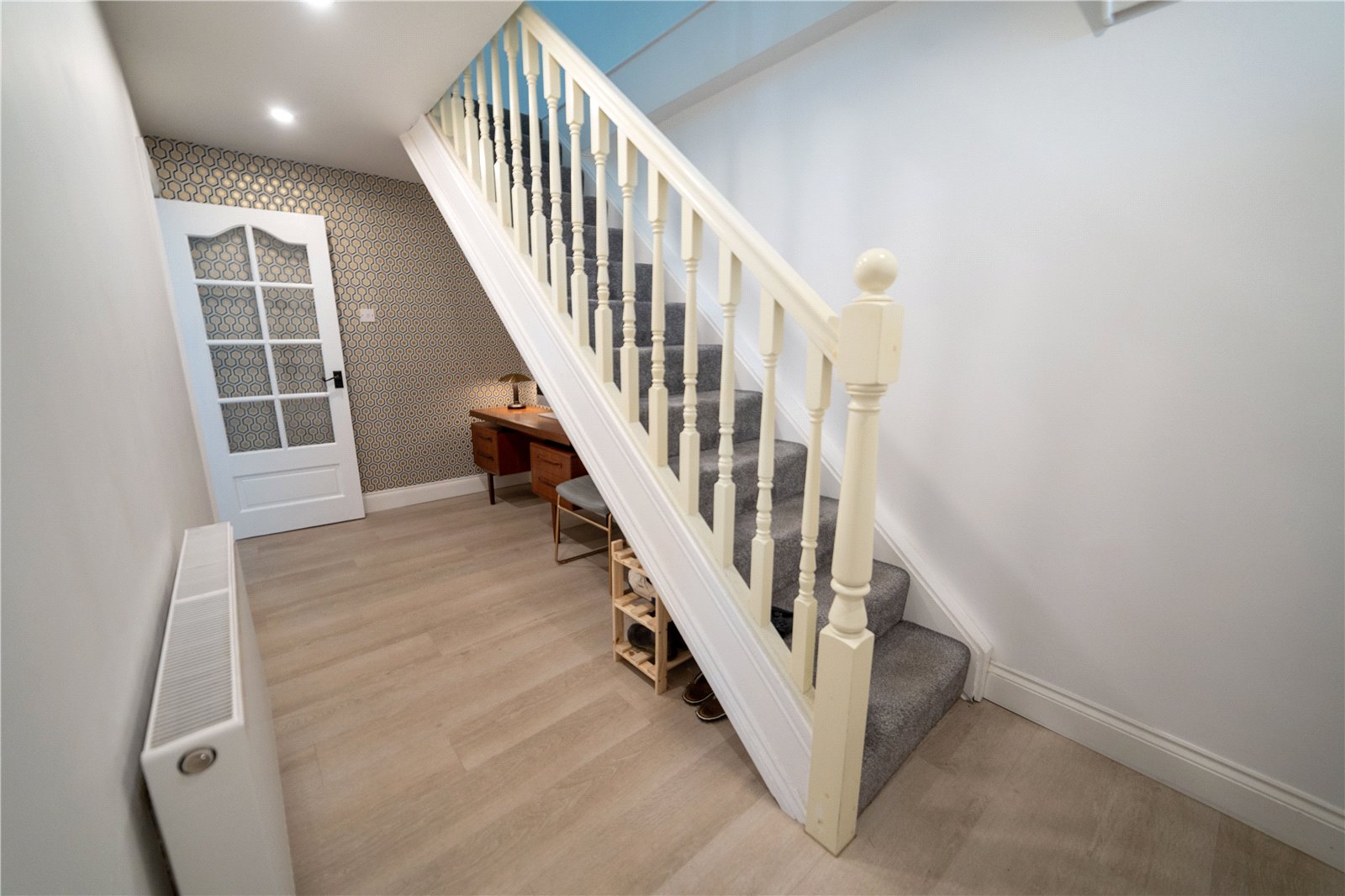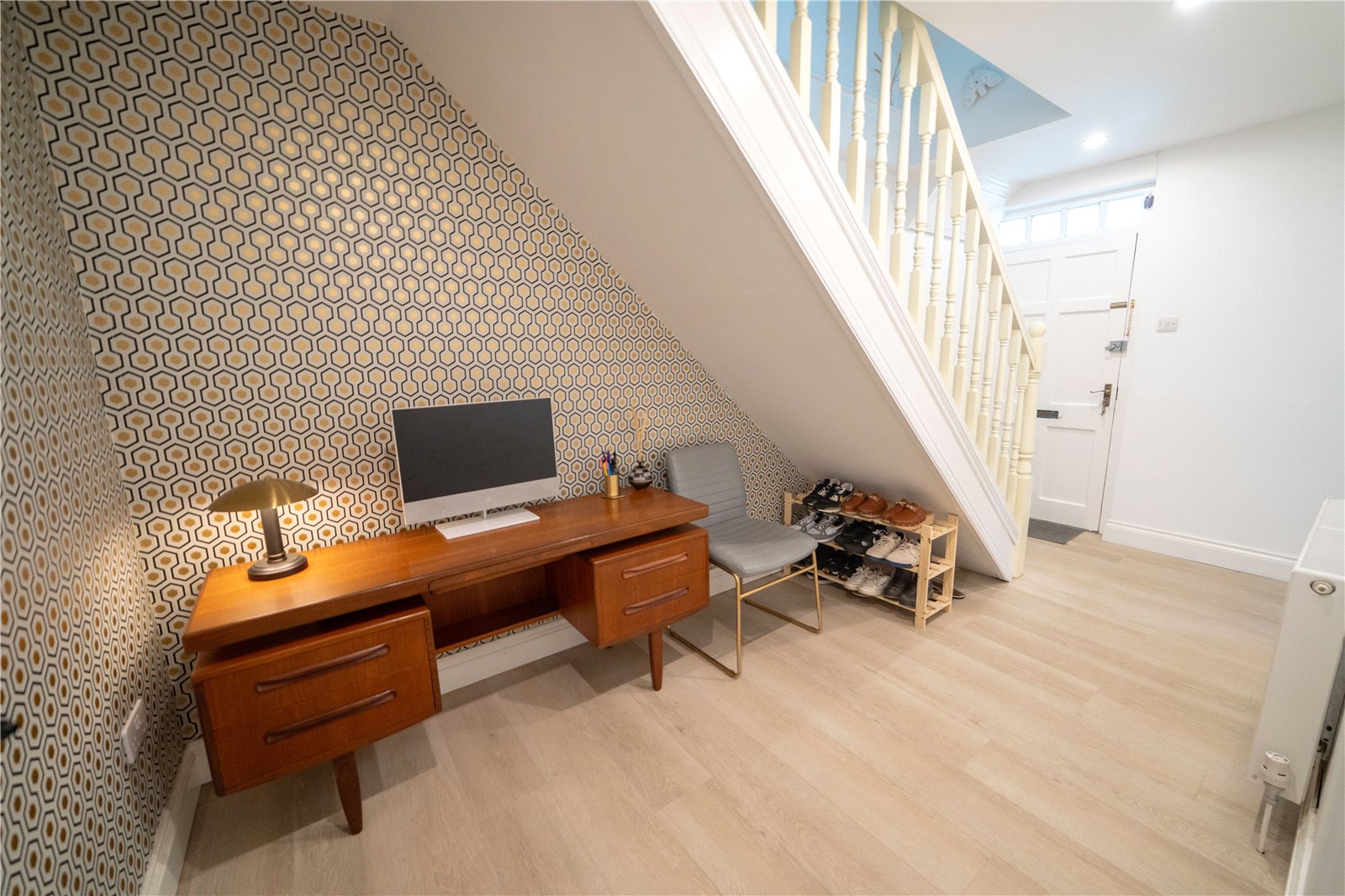 Flooring is a slip proof, waterproof, stain & scratch resistant matt vinyl floorboard. Spacious under stair space currently being used as an office, wallpapered using Cole & Son luxury wallpaper.
