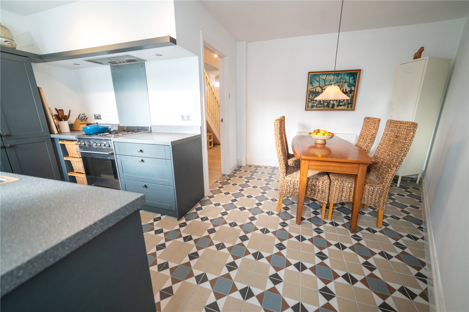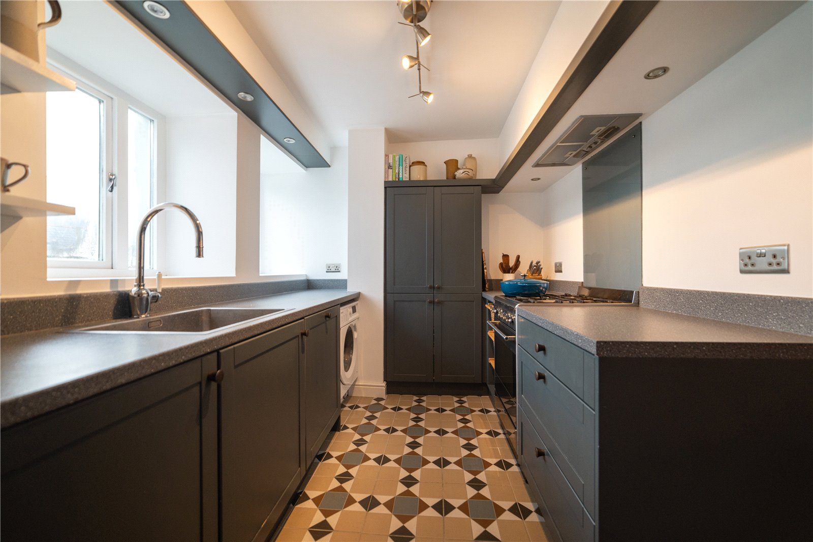 Flooring is Victorian style porcelain tiles, kitchen designed by Lawrence Lyon’s with custom joinery fitted kitchen units, integrated pantry/larder cupboard, door leading to garden and wooden double glazed window overlooking the garden.