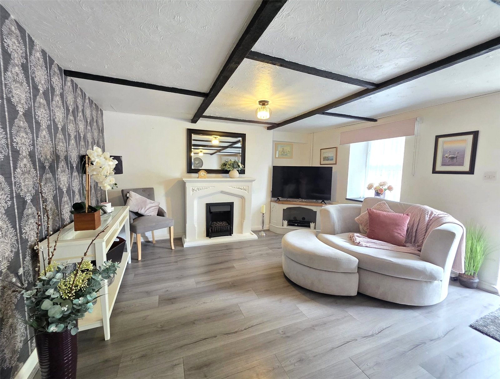 Part glazed entrance door, two windows to front aspect, two radiators. Feature fire place with electric fire, original ceiling beams.