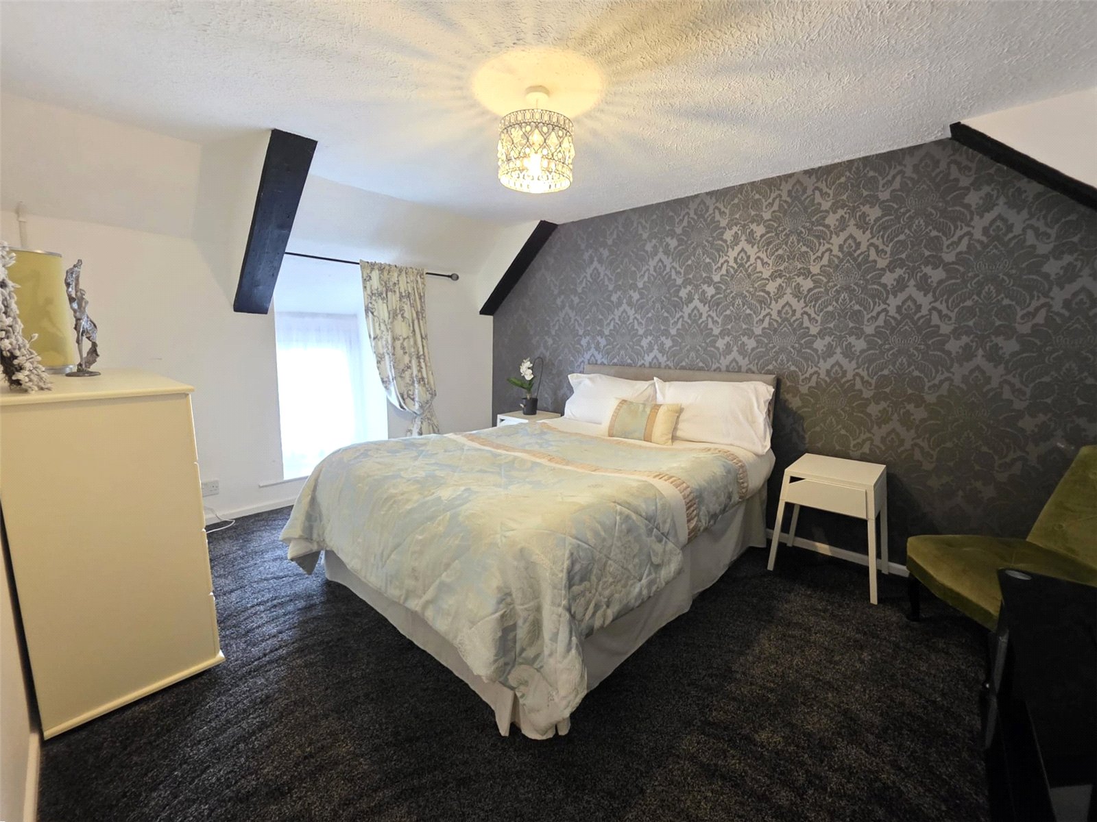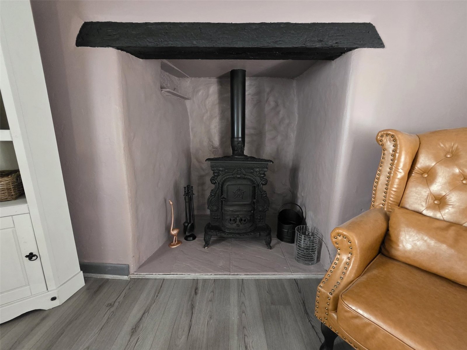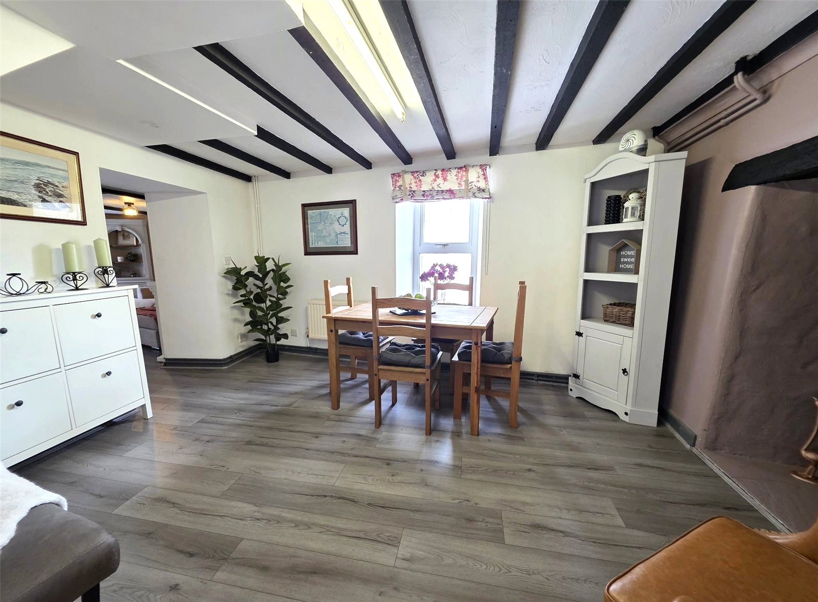 Window to side aspect, inglenook fireplace with wood burner. Original ceiling beams, radiator.