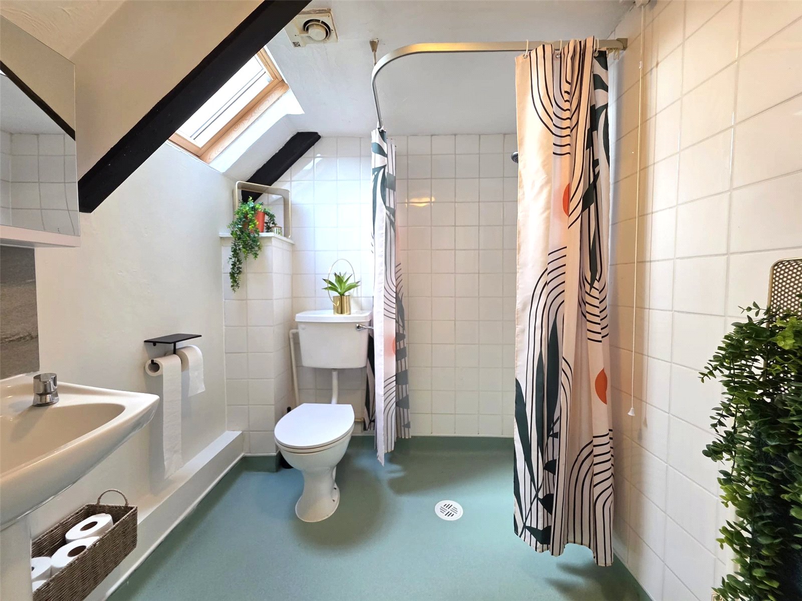 Skylight, shower, wash hand basin, wc, radiator.