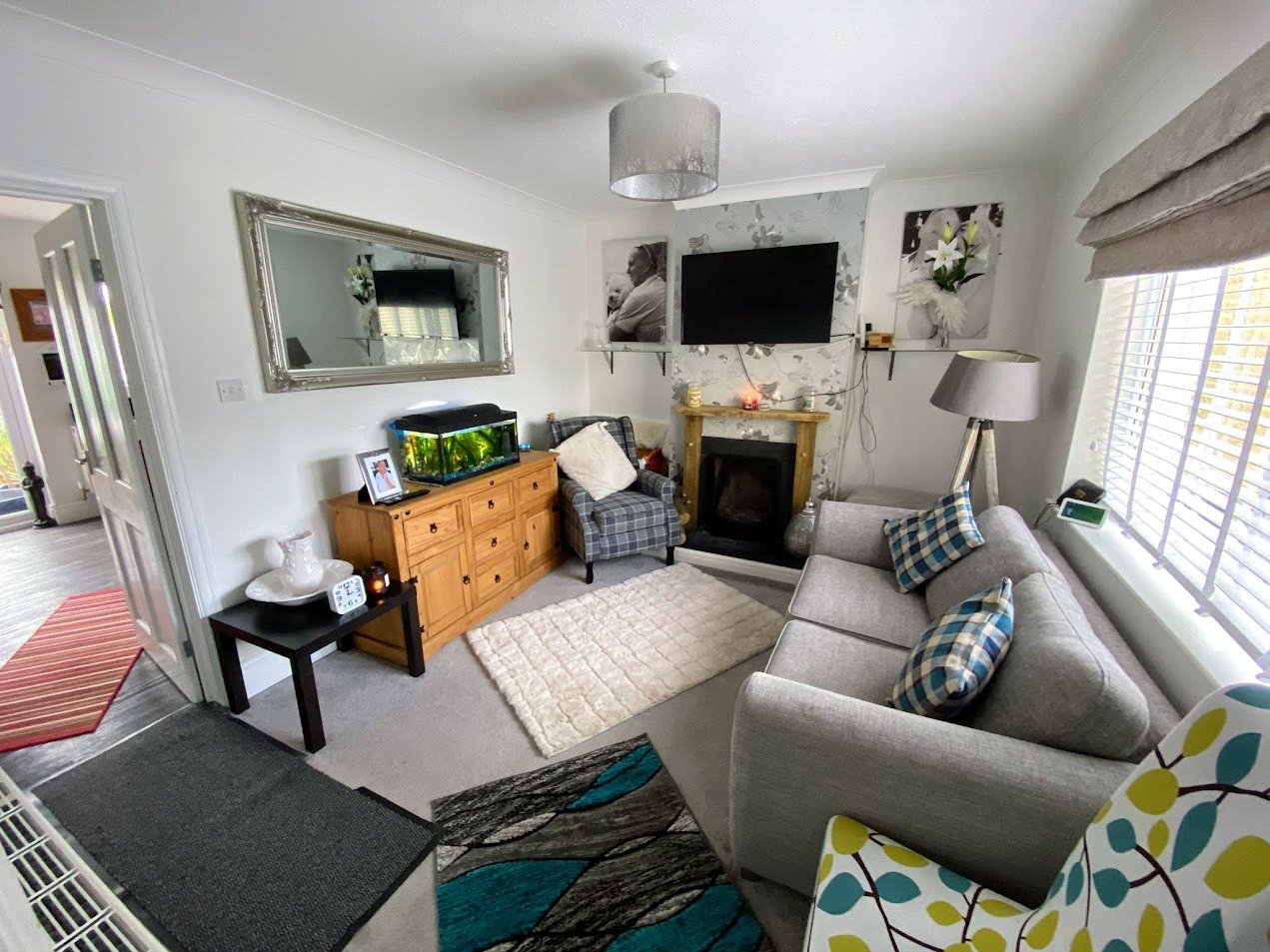 Carpeted floor, solid fuel working fire with wooden mantel and slate hearth, uPVC double glazed window, pendant light, radiator