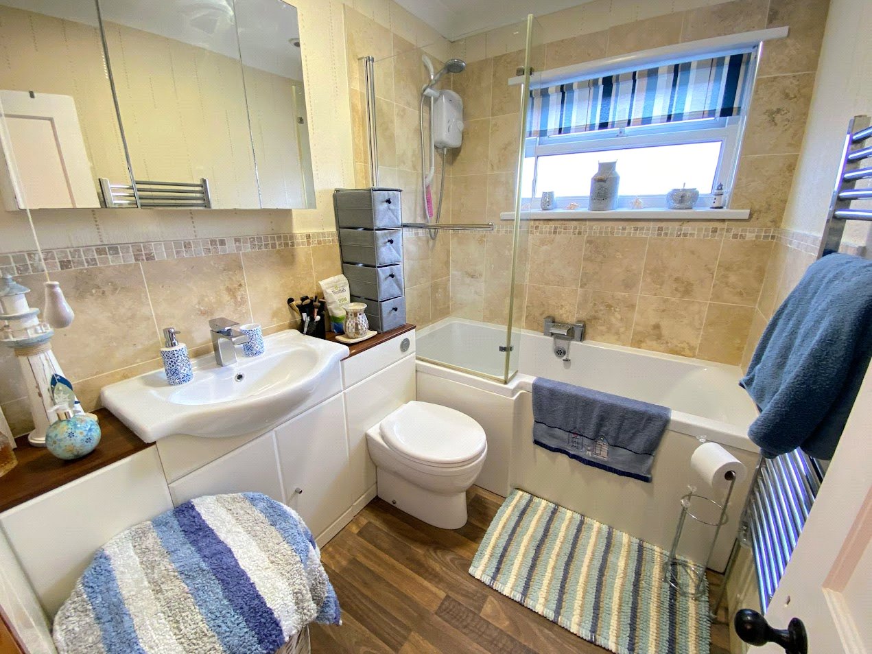 L shaped bath with mixer taps with electric shower over, marble style tiling, wash basin with mixer taps in vanity unit, intergrated WC, heated towel rail, uPVC double glazed window with frosted glass, extractor fan, vinyl flooring.