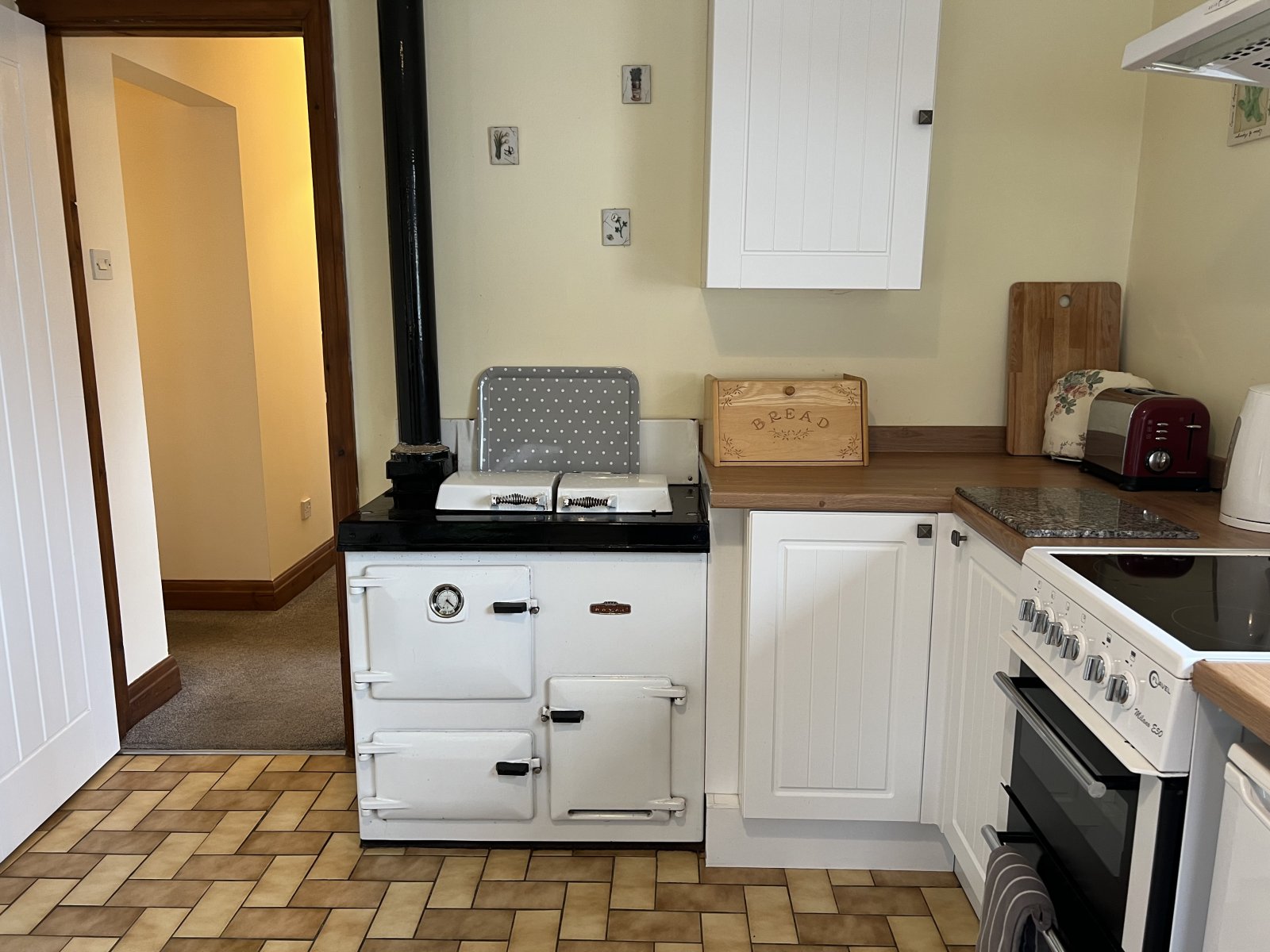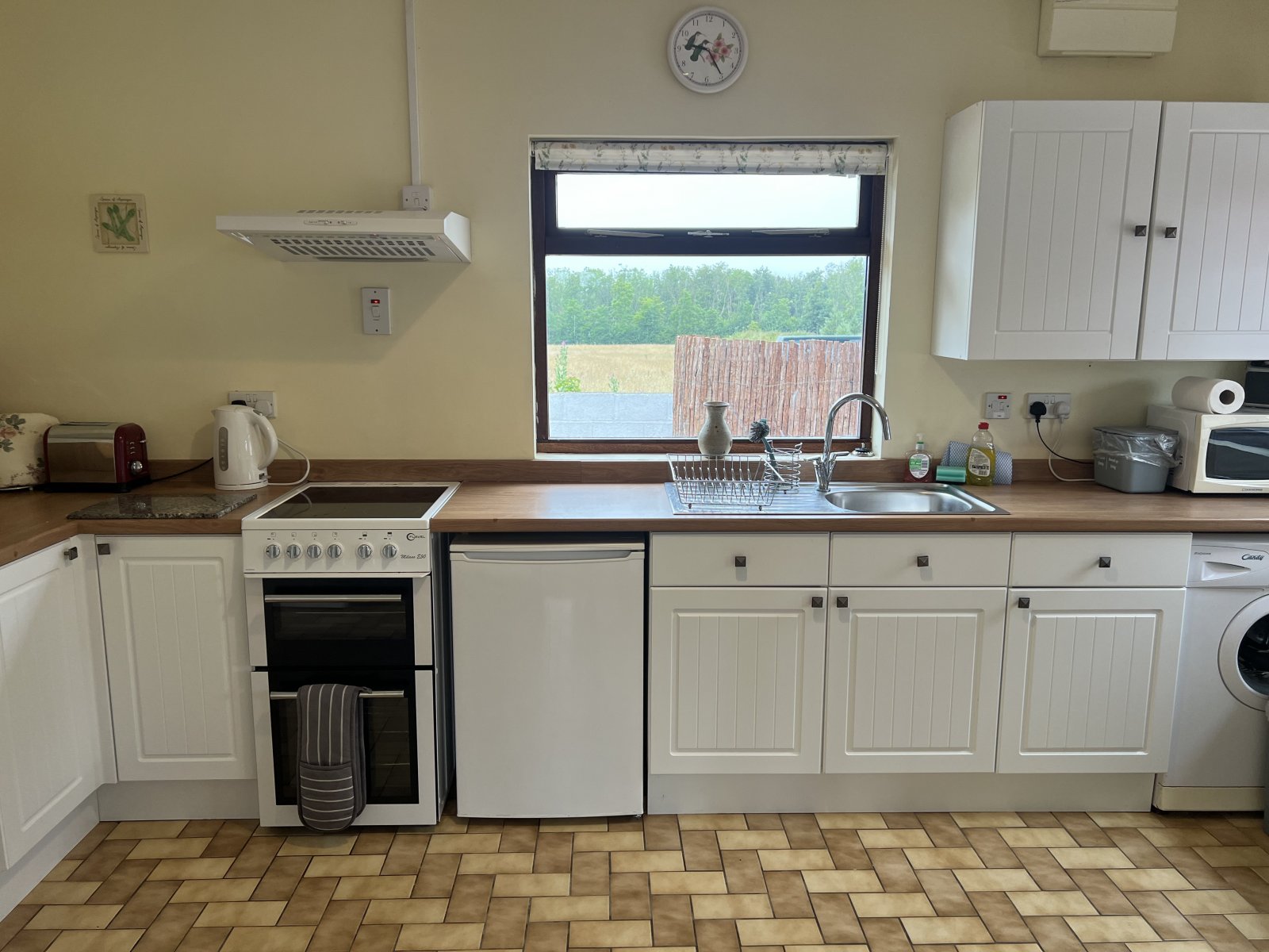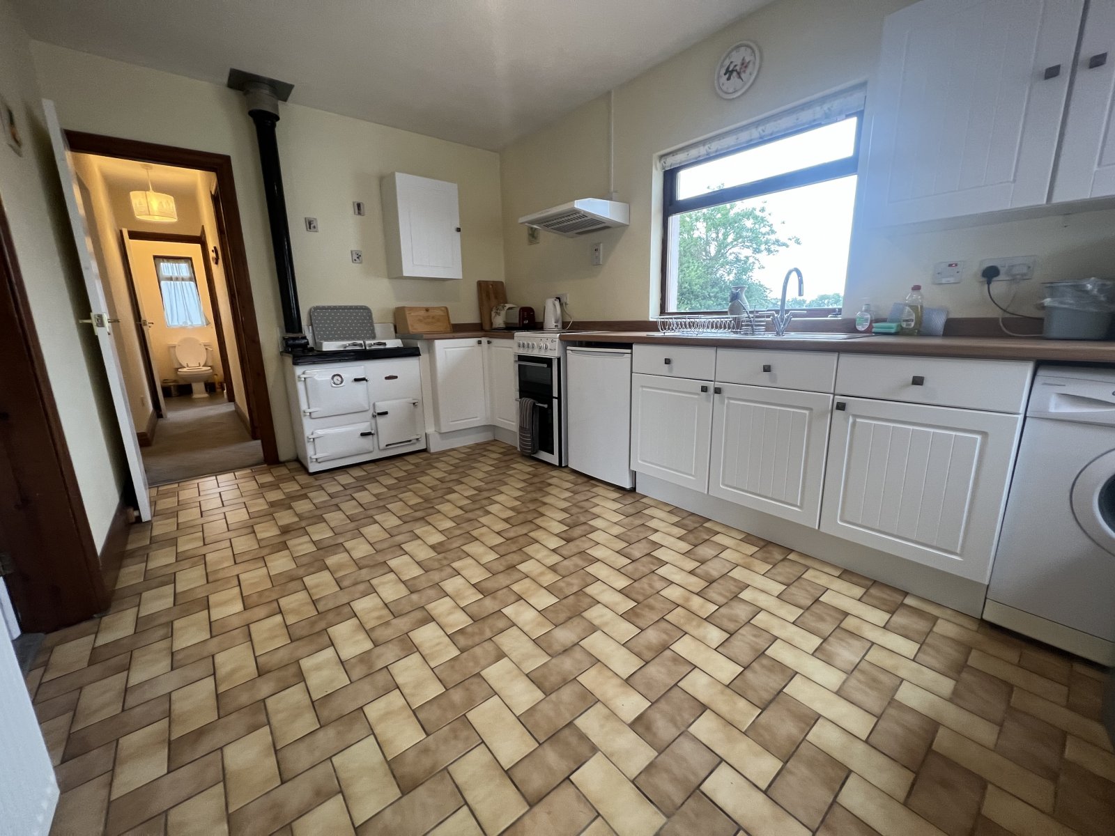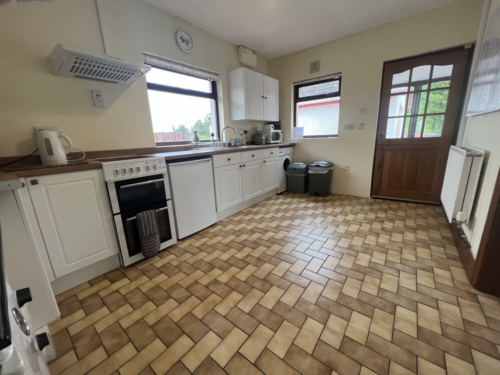 Tiled flooring, base and wall units, electric cooker, 1 x wall mounted radiator, mixer tap sink, 2 x wooden framed double glazed windows, central ceiling light.