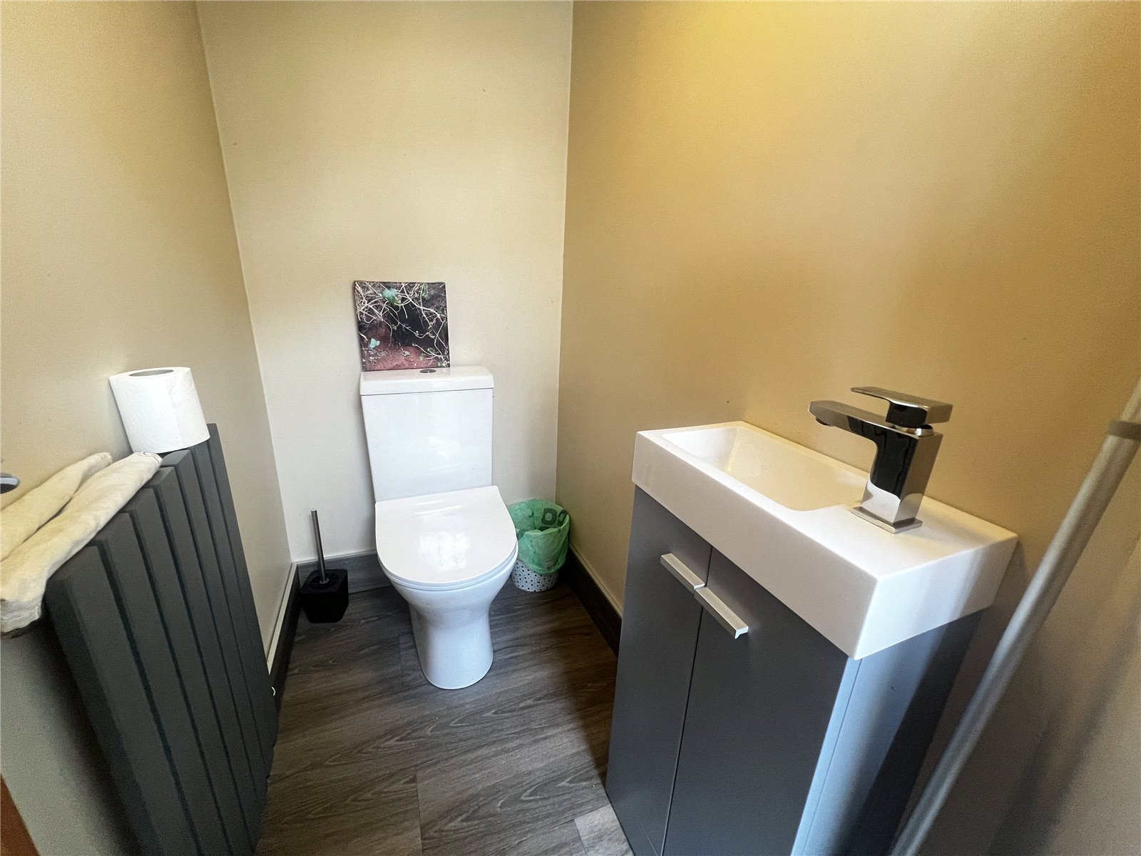 A convenient WC off the dining area, featuring a WC, wall and base-mounted wash hand basin, LVT flooring and a wall-mounted half-length radiator.