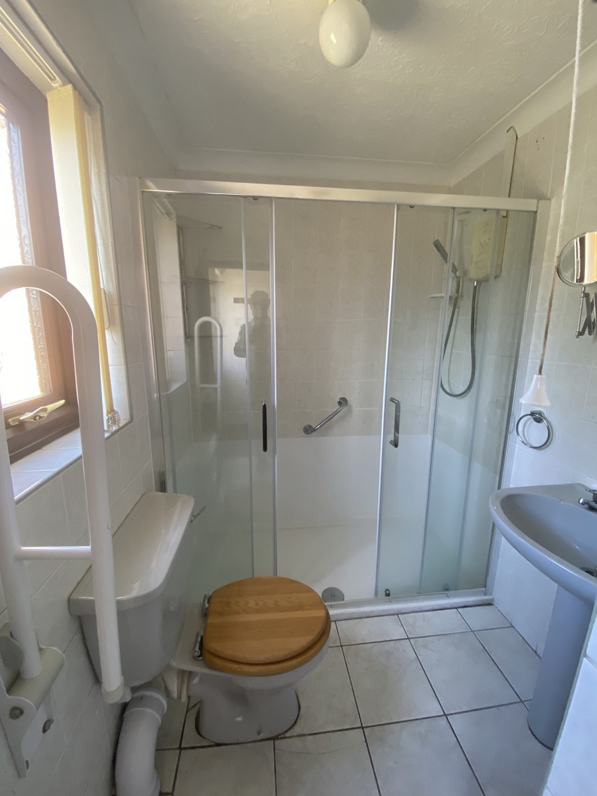 Comprising a W.C., wash hand basin, walkim shower , tiled floors, light fitting.
