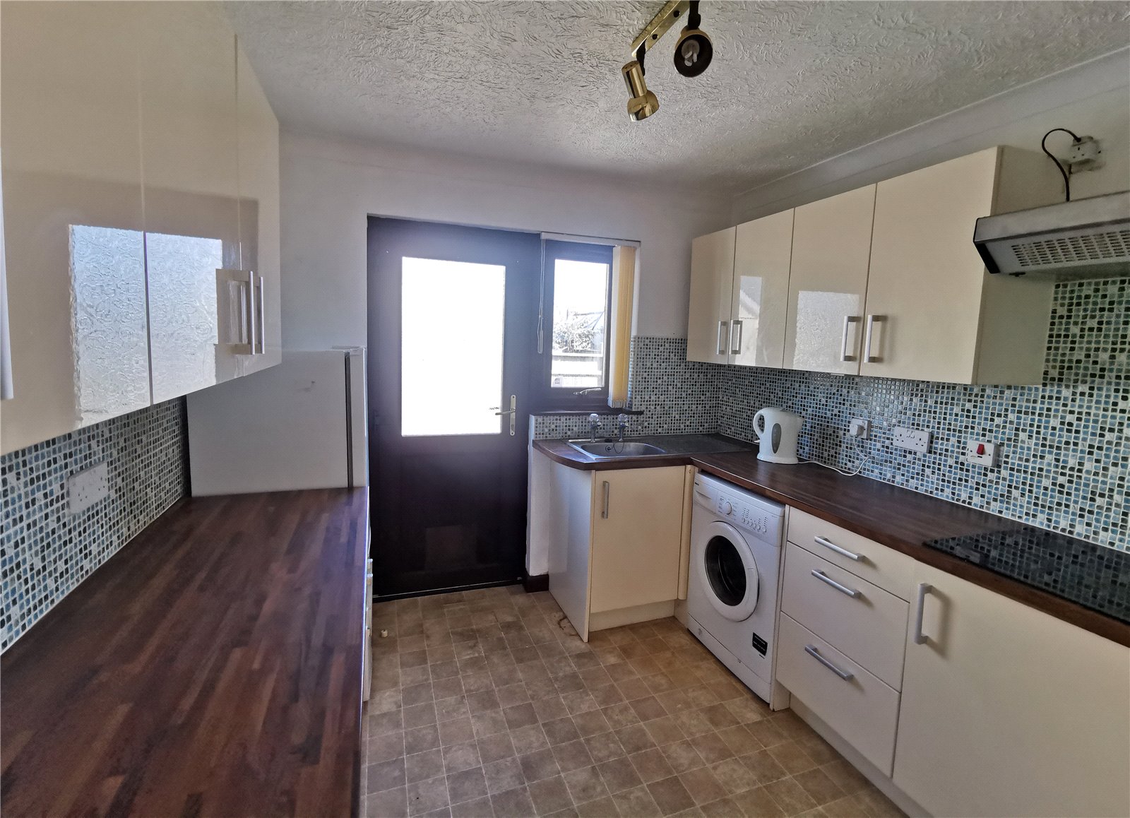 Affording a range of matching base and wall mounted units with complimentary work surface over, incorporating a stainless steel sink and drainer unit, mosaic effect splash backs, plumbing for an automatic washing machine, 4 ring hob with hood over. Door and window to the side.