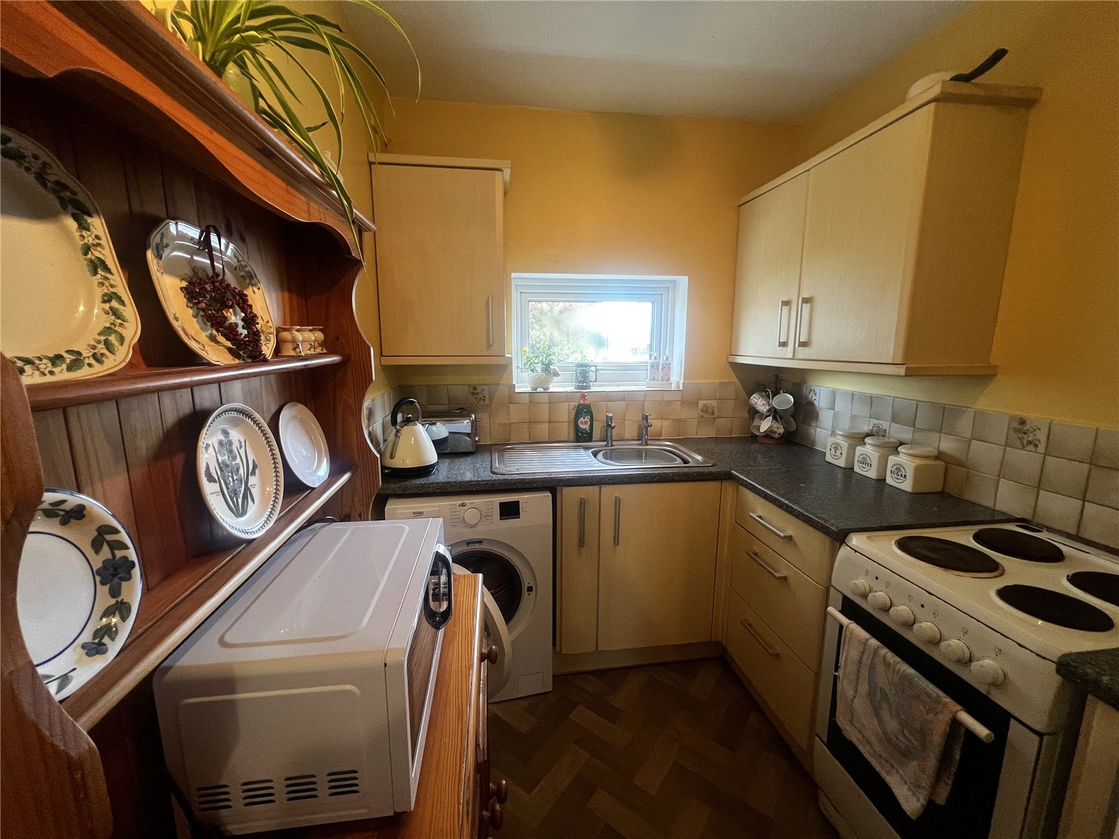 Kitchen with vinyl flooring, tiled splashback, and a double-glazed window. Fitted with wall and base units, sink with drainer, and spaces for a cooker and white goods.