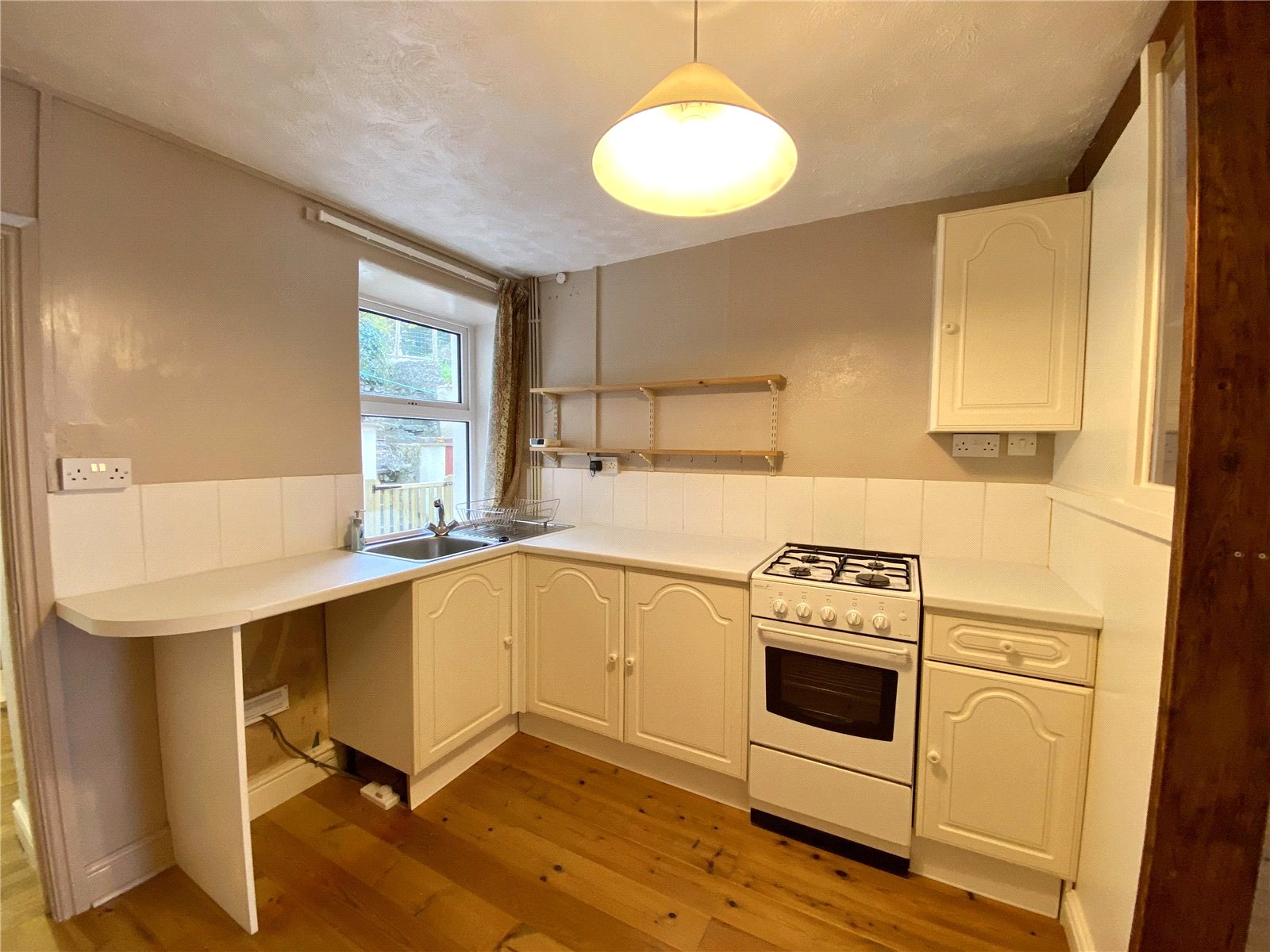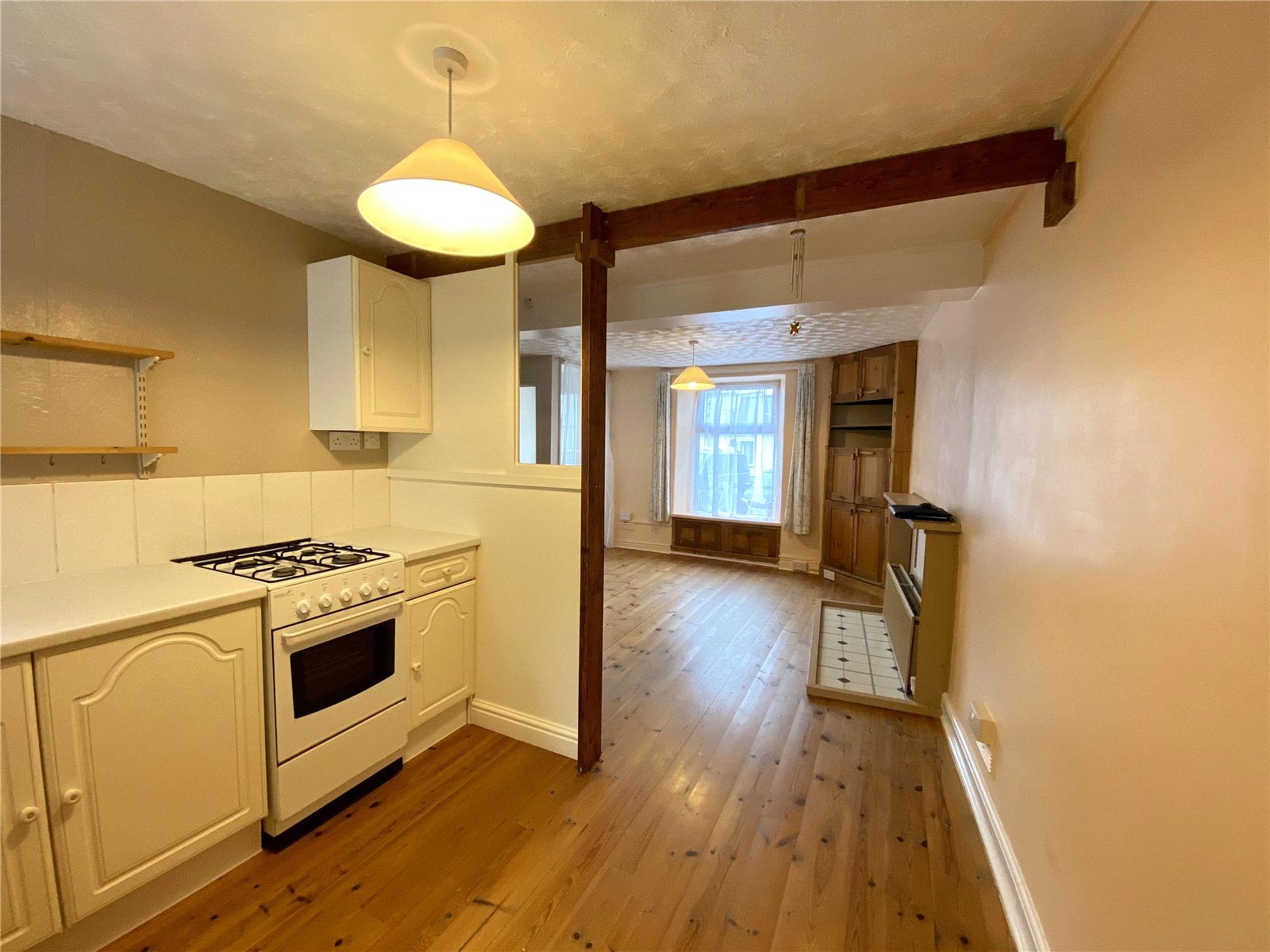 With floor and eye level units, stainless steel sink and drainer, gas oven and hob, rear-facing uPVC double-glazed window, wood flooring, light fitting. Access to;
